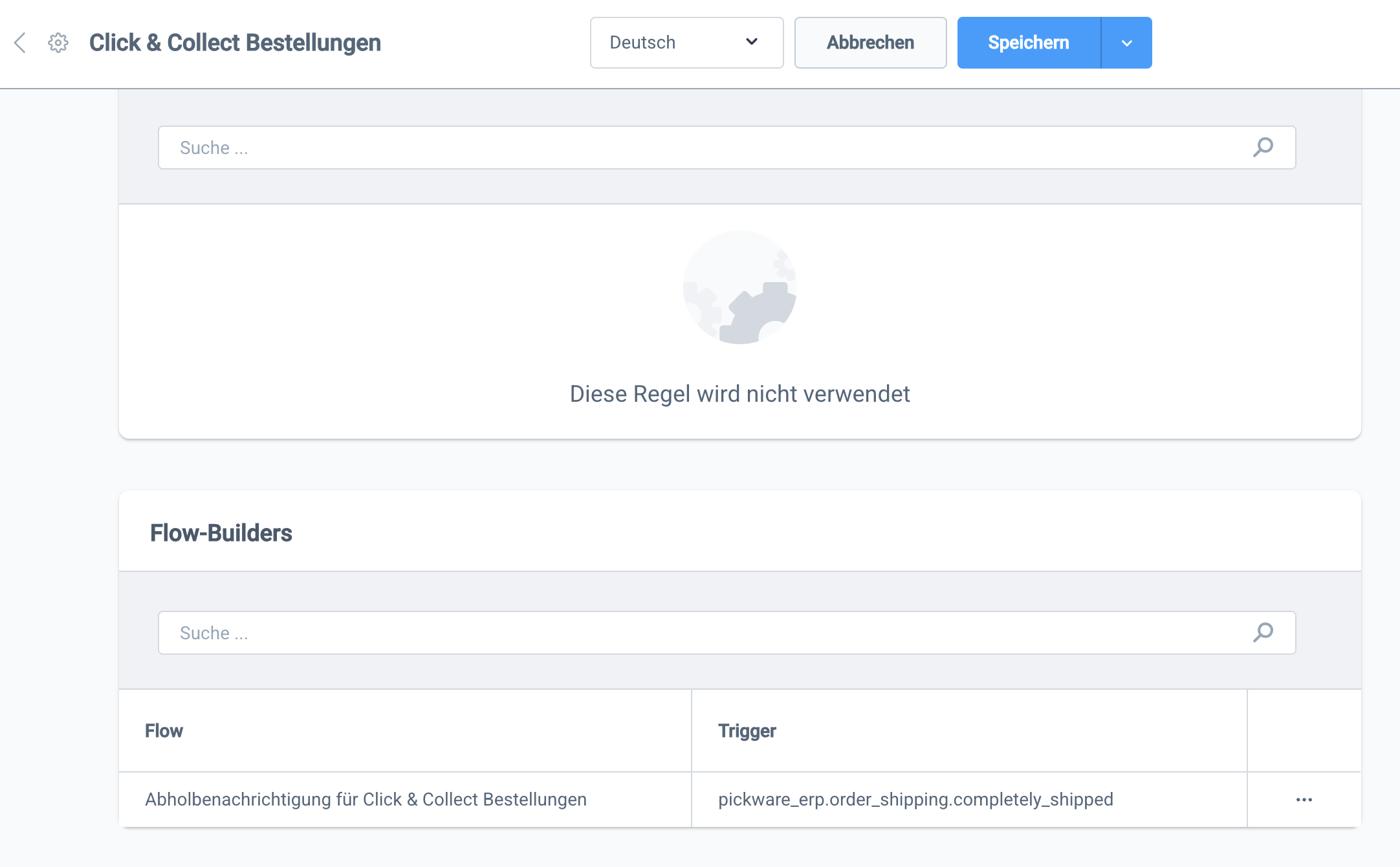 In diesem Fall wurde eine einfach Regel zum Filtern der Versandarten (hier die Versandart zur Abholung von Click & Collect Bestellungen) erstellt. Diese wird anschließend in einem Flow verwendet, um automatische Abholbenachrichtigungen zu versenden, sobald die Bestellungen abholbereit sind.