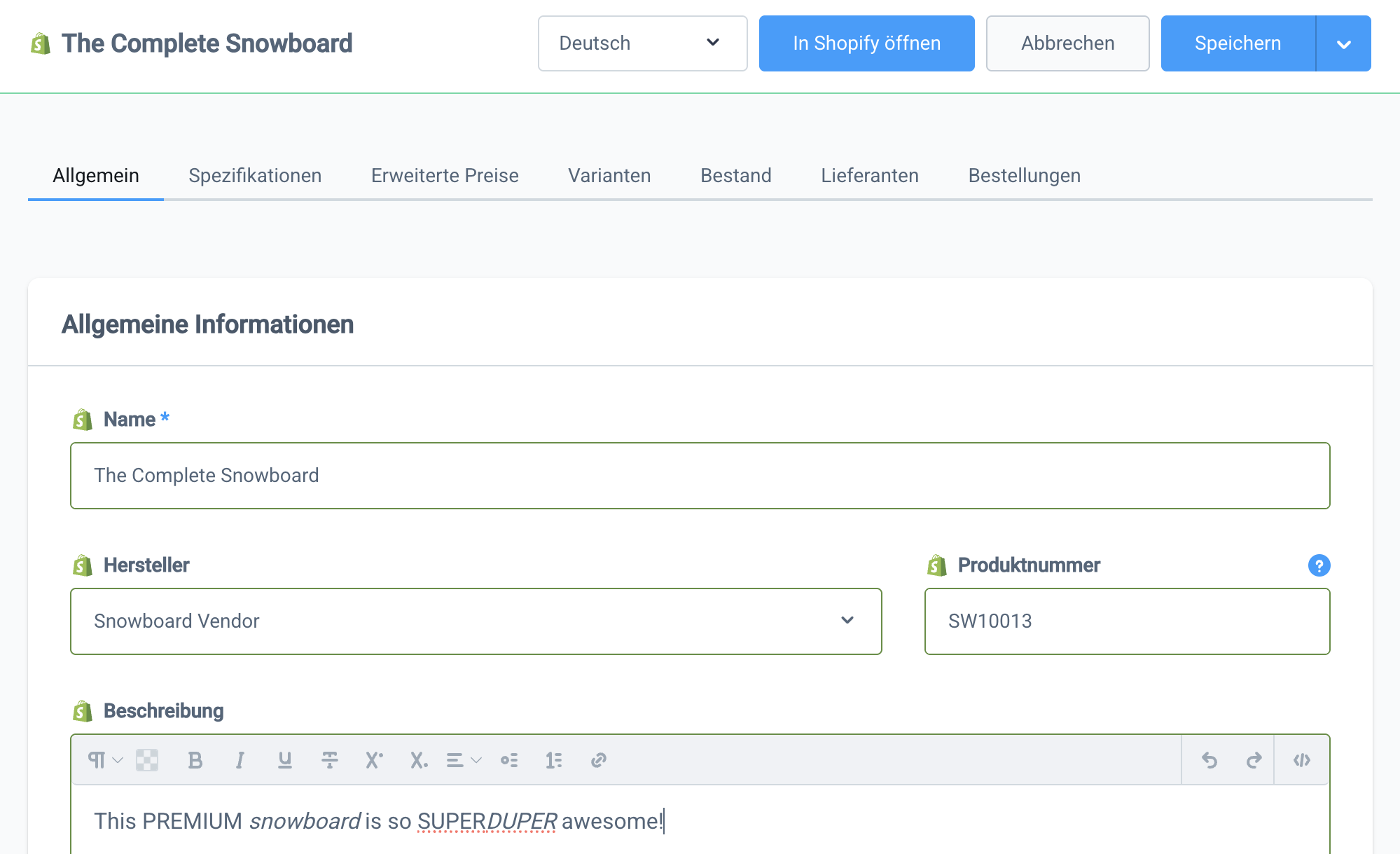 Du kannst in den Verkaufskanaleinstellungen bestimmte Produkteigenschaften vom Produktimport ausschließen. Diese werden dann in Pickware nicht länger durch den Produktimport überschrieben. Analog dazu verschwindet das Shopify Symbol neben dem entsprechenden Feldnamen. Mehr dazu findest du hier.