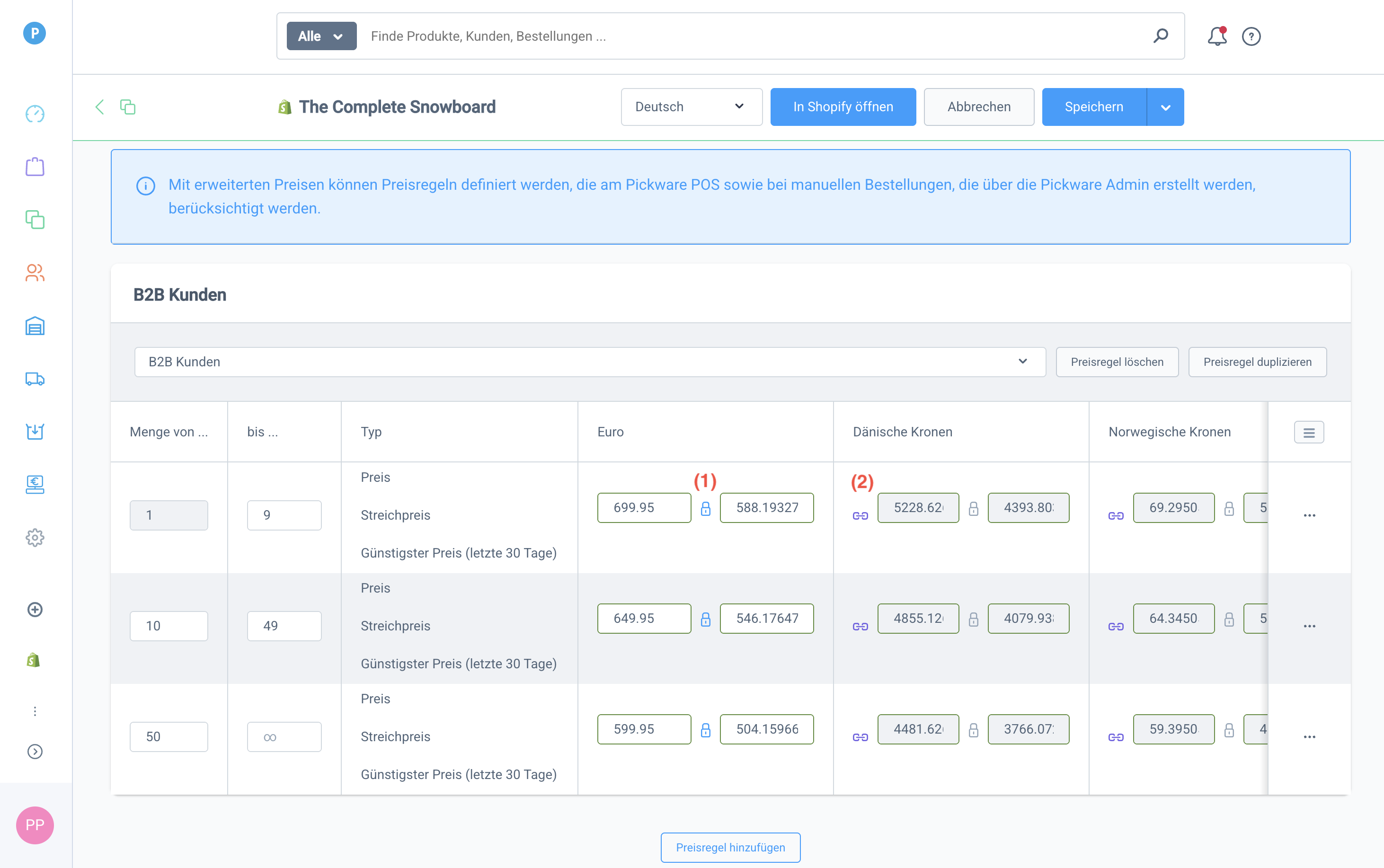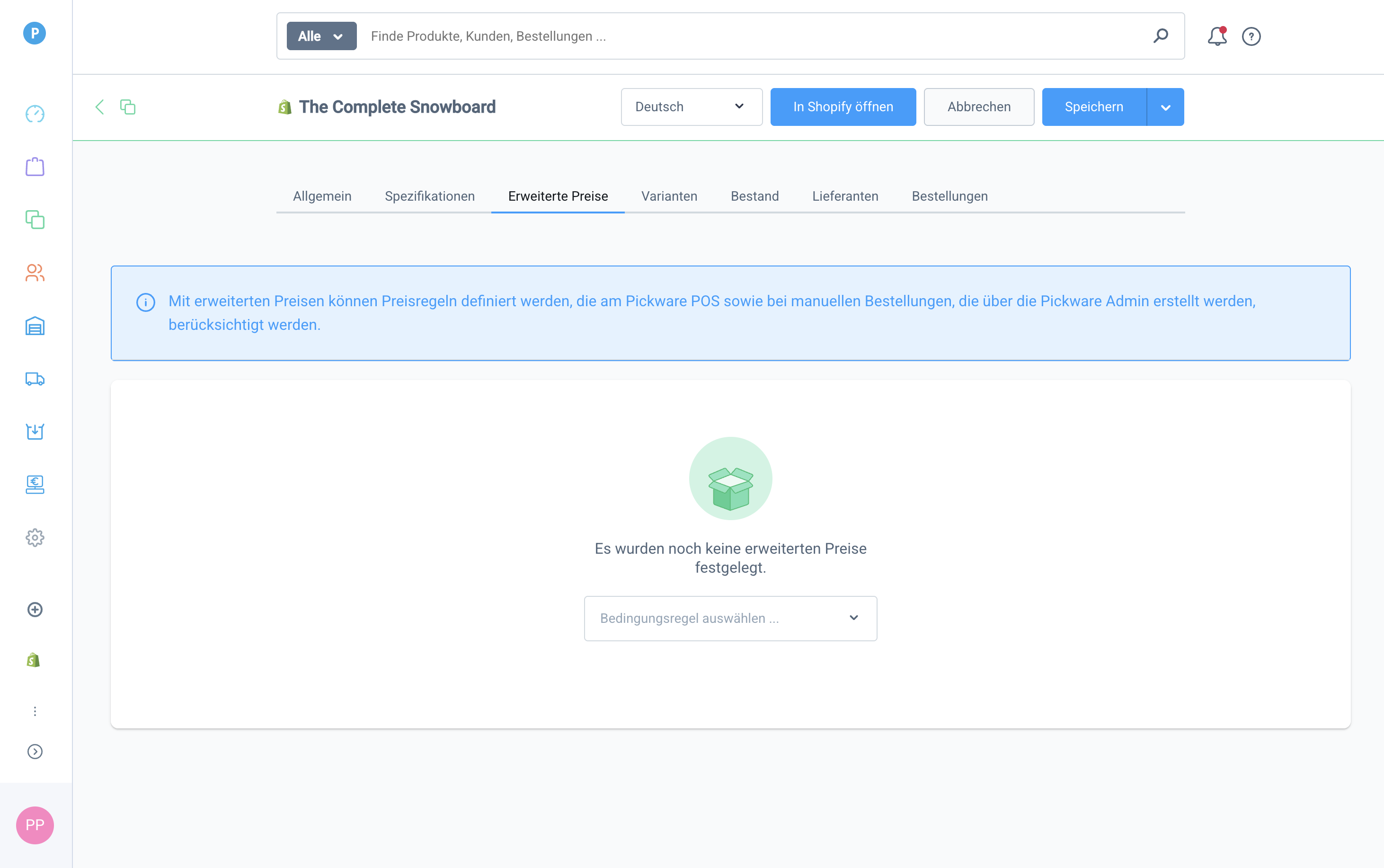 In der Pickware Admin in den Produkteigenschaften im Tab Erweiterte Preise kannst du auf Basis von Preisregeln unterschiedliche Preise beispielsweise je nach Kundengruppe, Bestellmenge, Lieferland, Versand- oder Zahlungsart hinterlegen. Die Regeln greifen für manuell angelegte (B2B-)Bestellungen oder Bestellungen über Pickware POS.