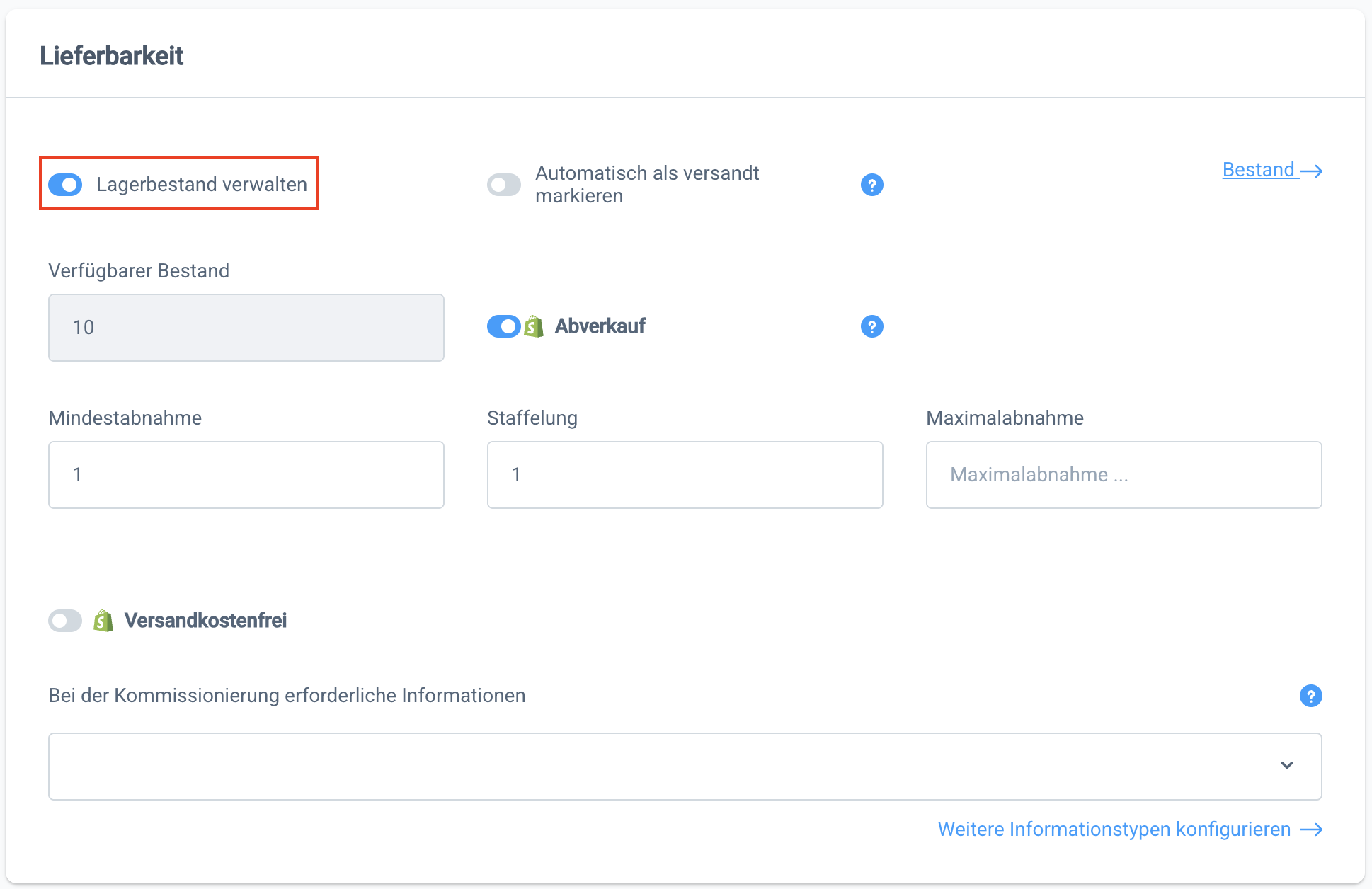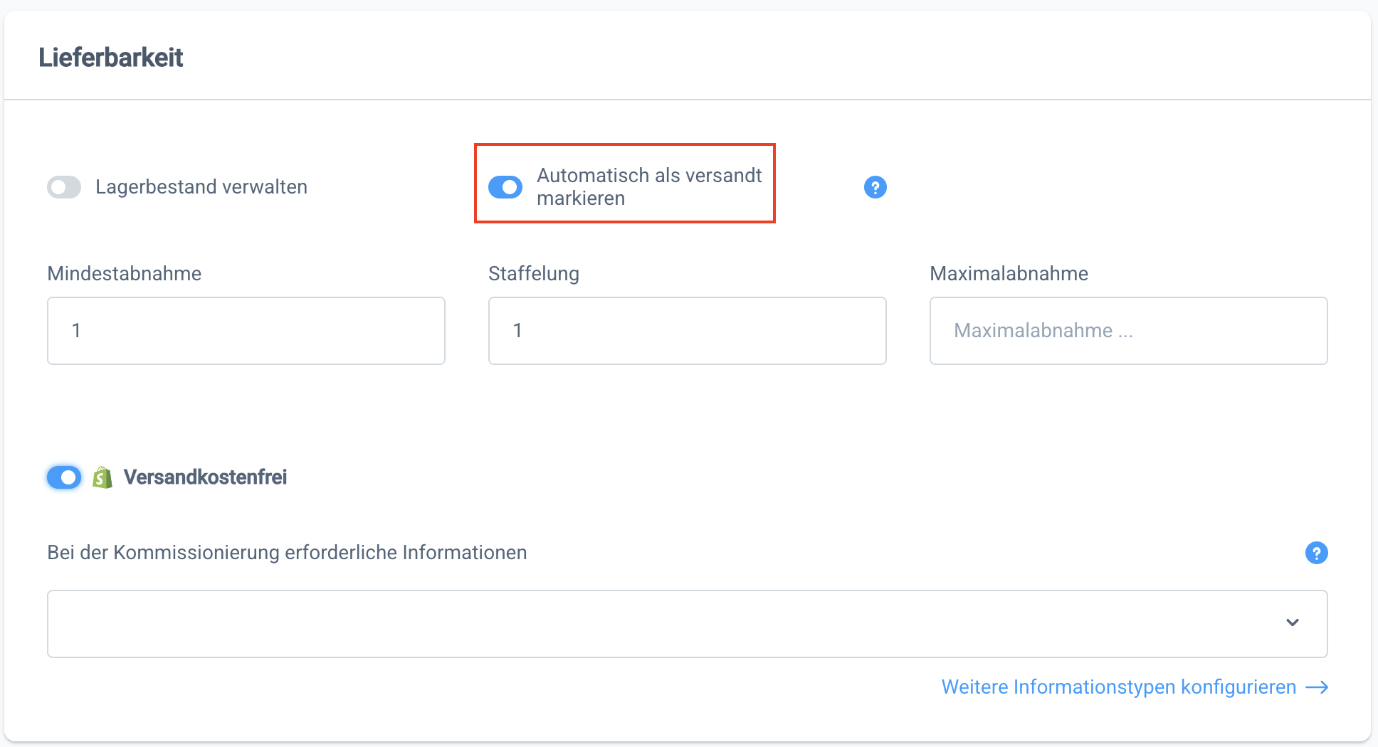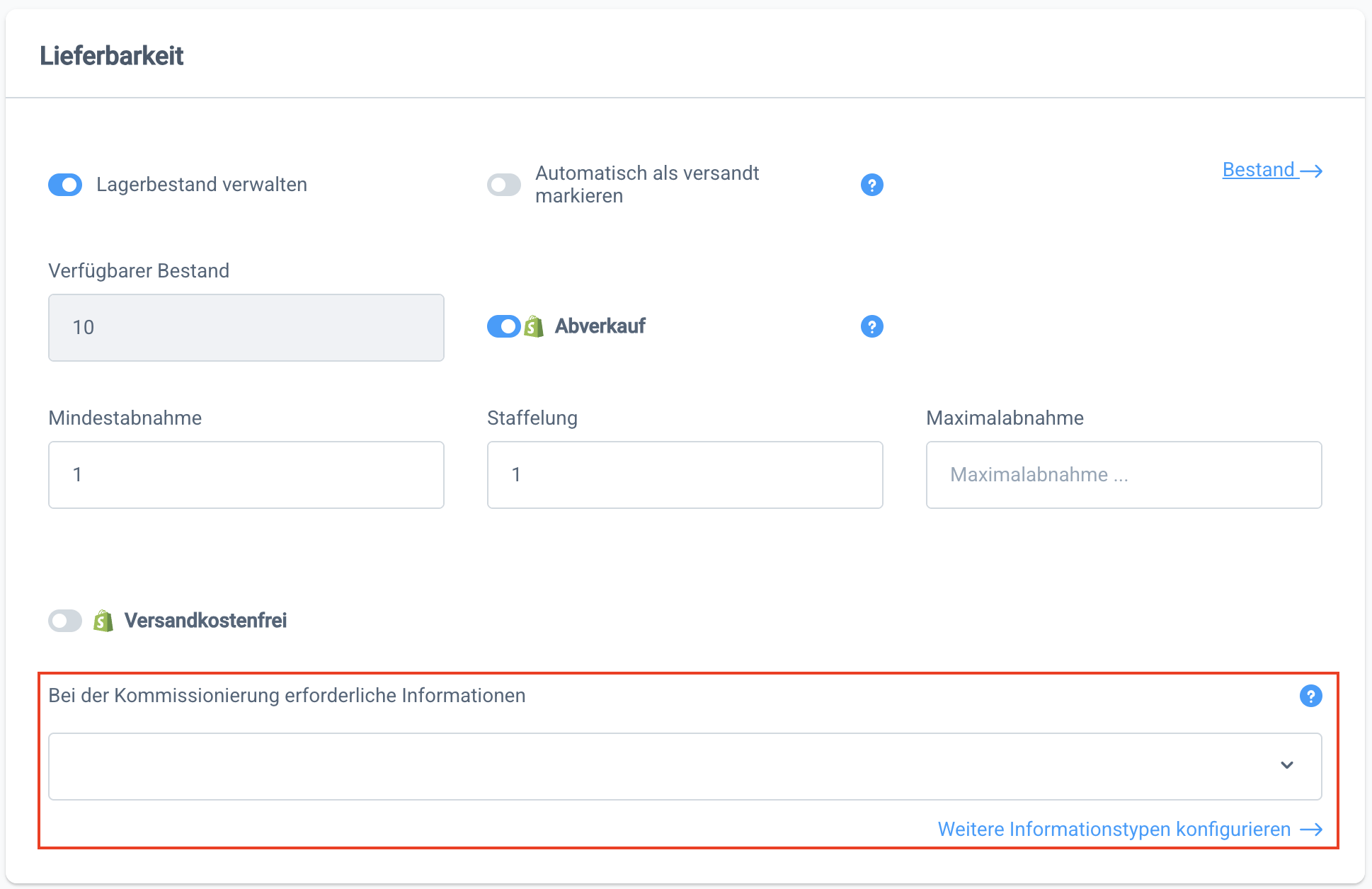 Anschließend kannst du in der Produktdetails im Abschnitt Lieferbarkeit auswählen, welche davon bei der Kommissionierung abgefragt werden sollen.