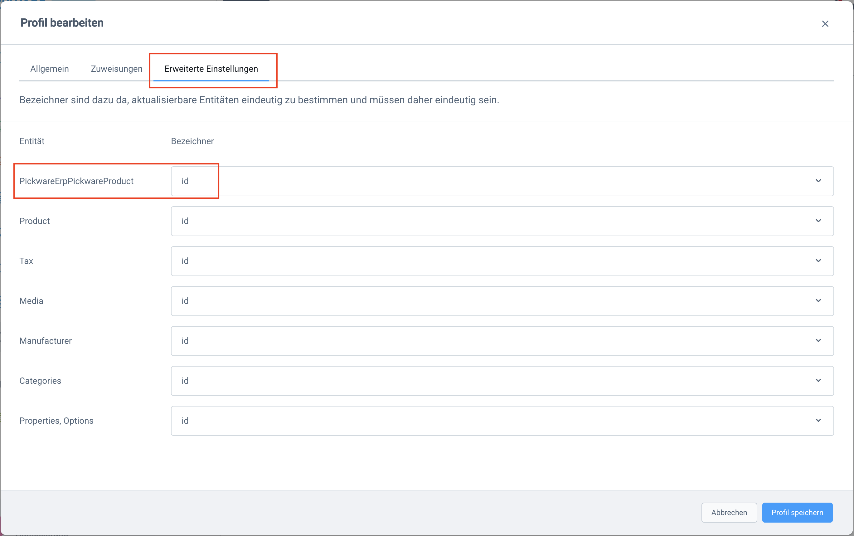 Wechsle nun zum Tab Erweiterte Einstellungen und weise dort der Entität Pickware ErpPickwareProduct den Bezeichner id zu.