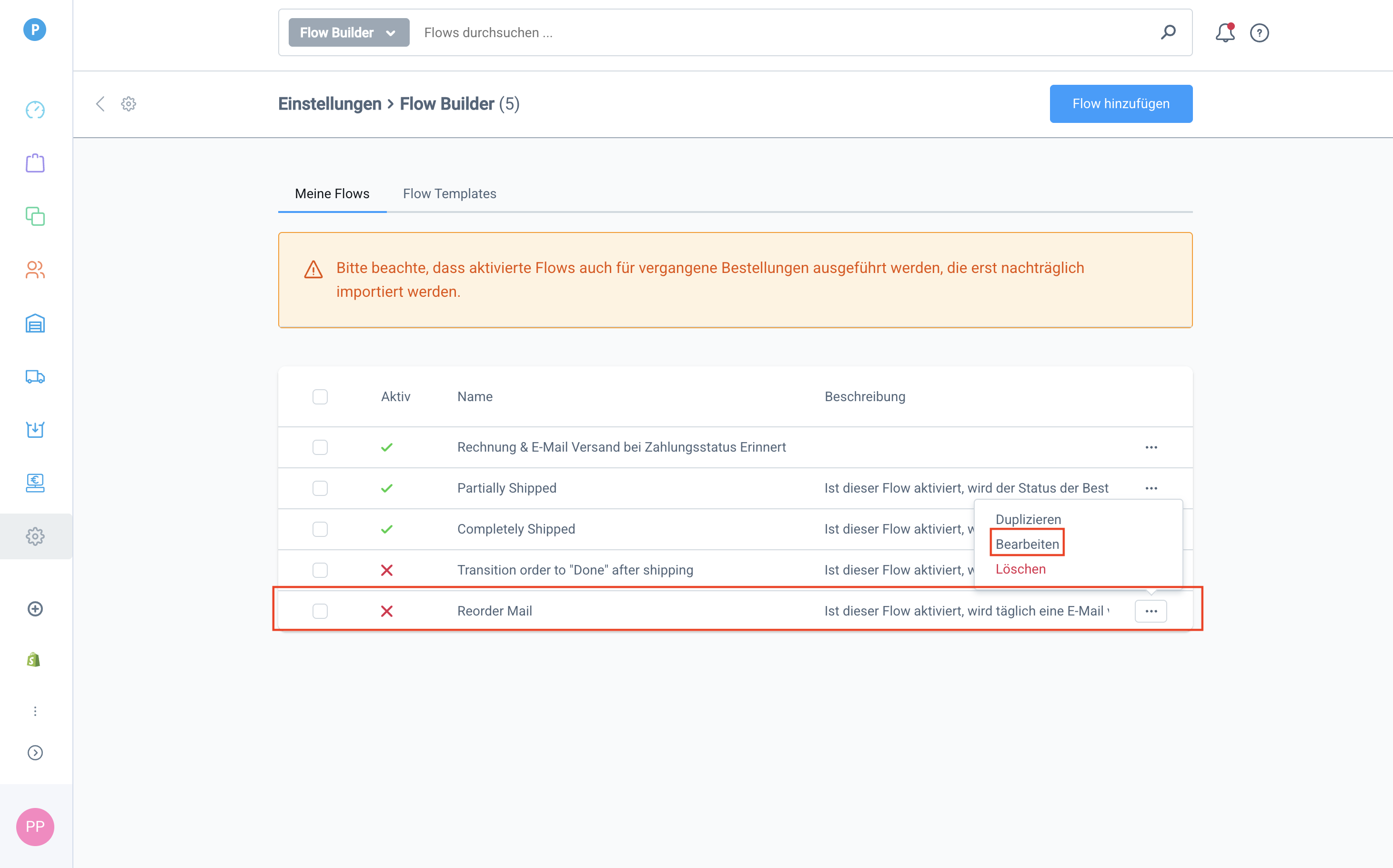 Gehe dazu auf EinstellungenShopFlow Builder und suche nach dem Flow Reorder Mail. Klicke dort im Kontextmenü auf Bearbeiten