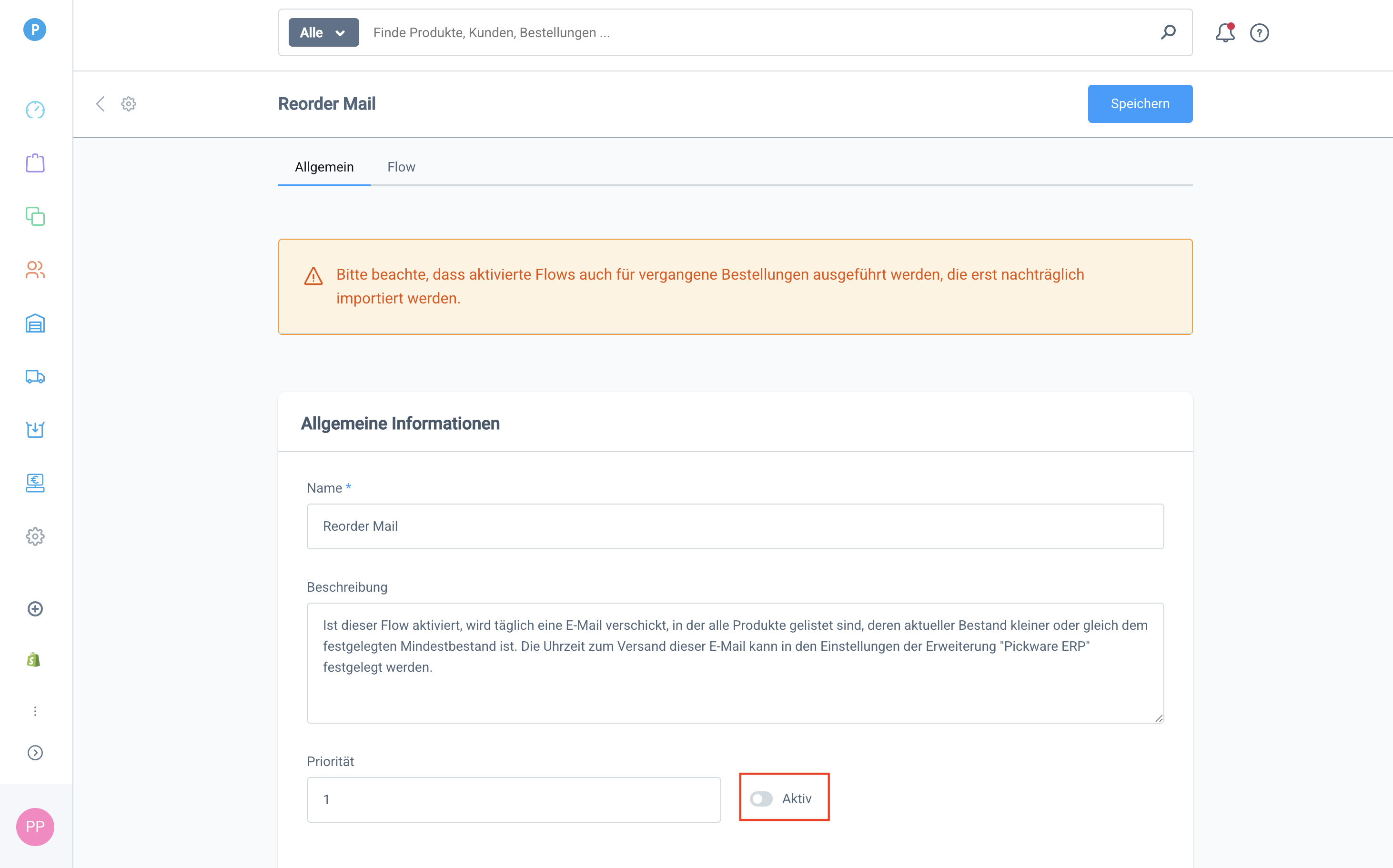 Aktiviere den Flow über die Checkbox und klicke dann oben auf Speichern.
