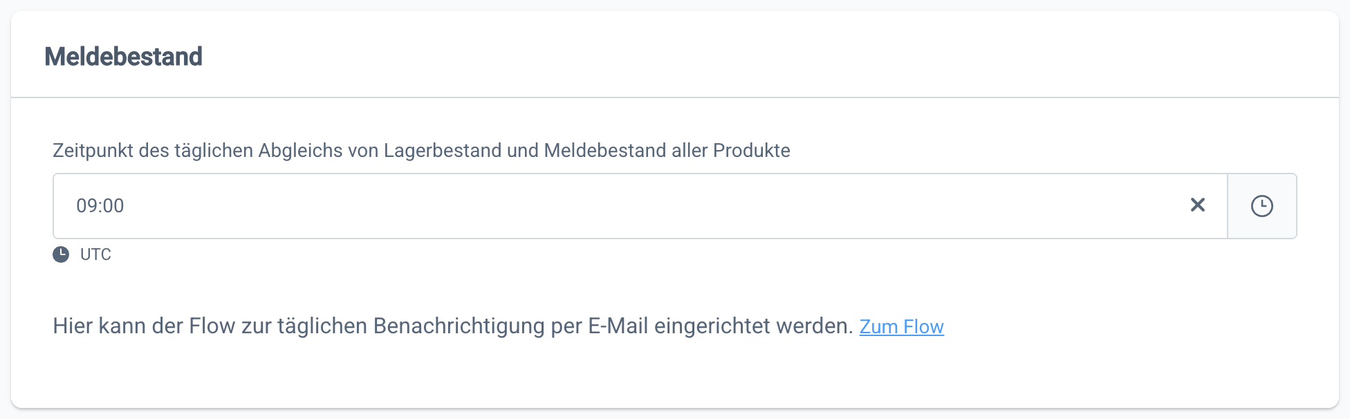 Über den Flow Builder kannst du dir täglich eine Liste aller Produkte per E-Mail zukommen lassen, die den Meldebestand erreicht oder überschritten haben.