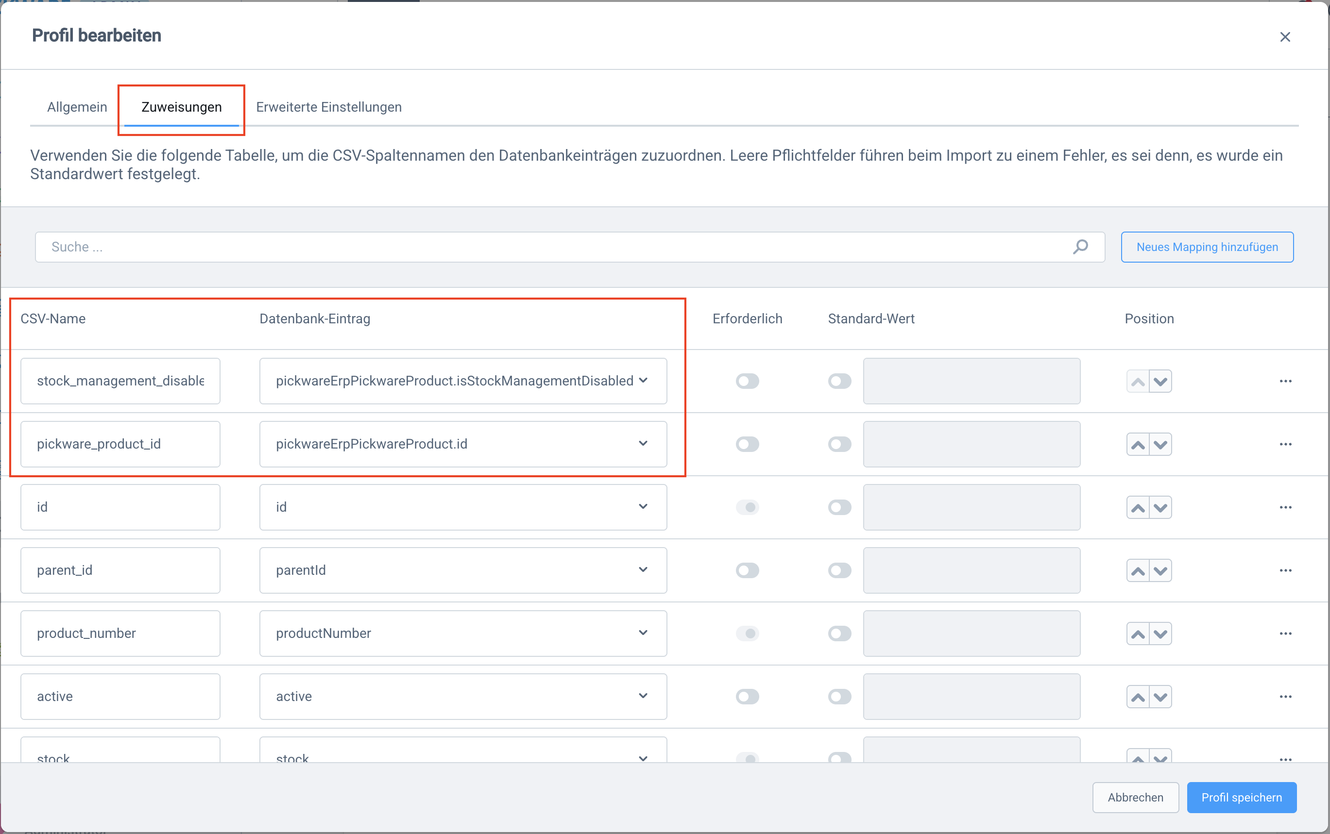 In den Profileinstellungen im Tab Zuweisungen müssen nun zwei neue Mappings hinzugefügt werden werden. Tipp: Du kannst die Bezeichnungen hier rauskopieren und in deiner Pickware Admin einfügen.