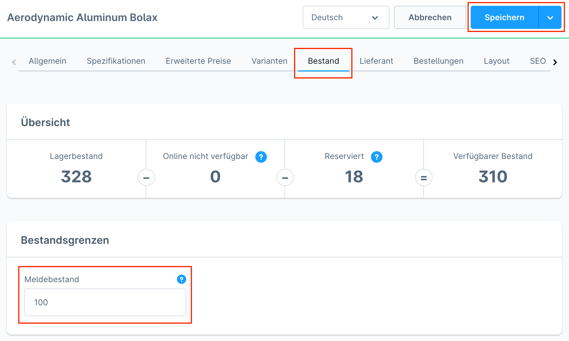 • Um den Meldebestand für einzelne Produkte zu hinterlegen, öffne innerhalb der Produktdetails den Tab Bestand. Im Abschnitt Bestandsgrenzen kannst du im Feld Meldebestand einen beliebigen Wert eintragen
