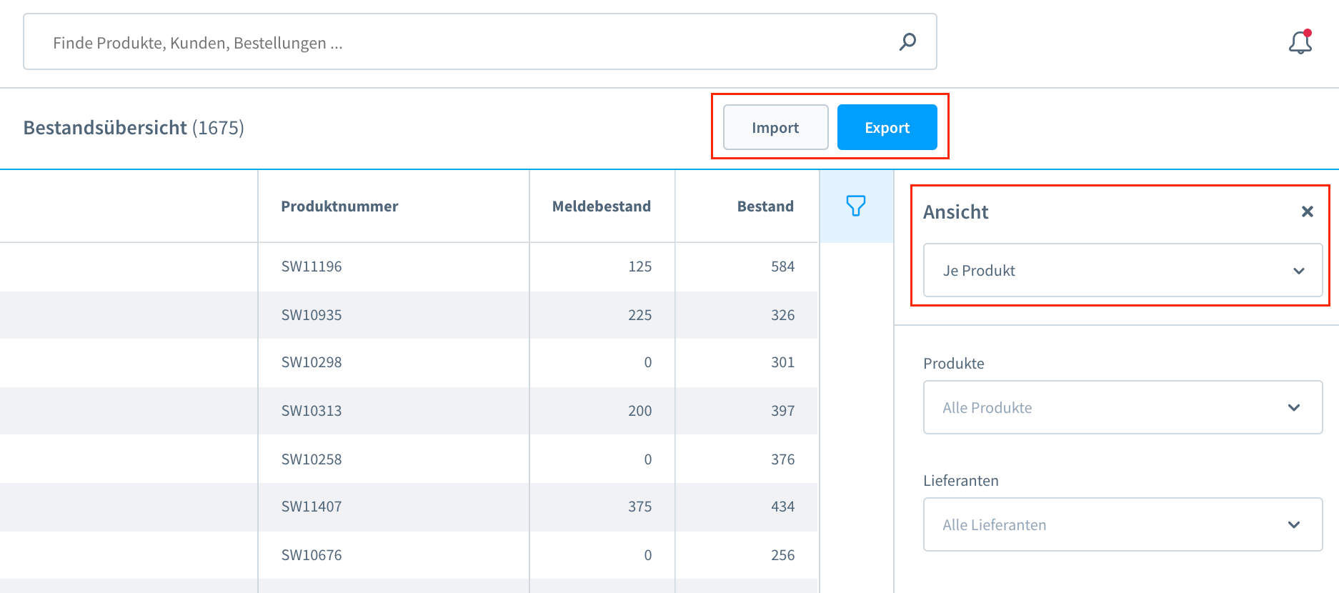 Den Meldebestand kannst du auch in der Bestandsübersicht einsehen, wenn du die Ansicht Je Produkt auswählst.