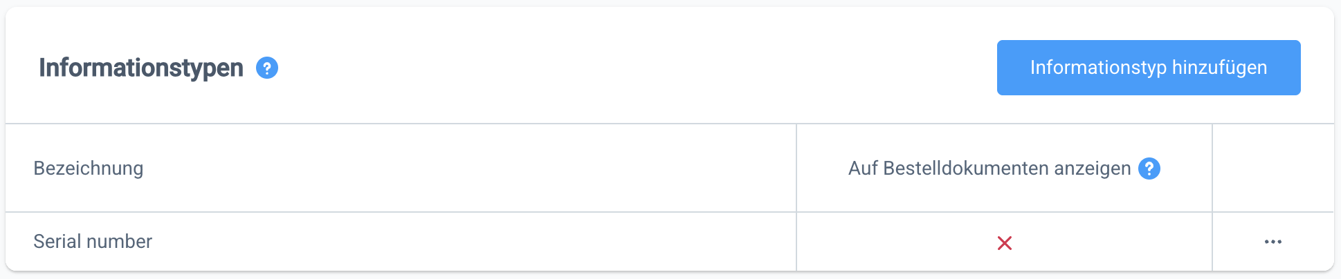 Hierzu müssen zunächst entsprechende Informationstypen unter Einstellungen → Erweiterungen → Pickware ERP → Informationstypen angelegt werden. Du kannst an dieser Stelle auch festlegen, ob der Informationstyp anschließend auf den Bestelldokumenten angezeigt werden soll.
