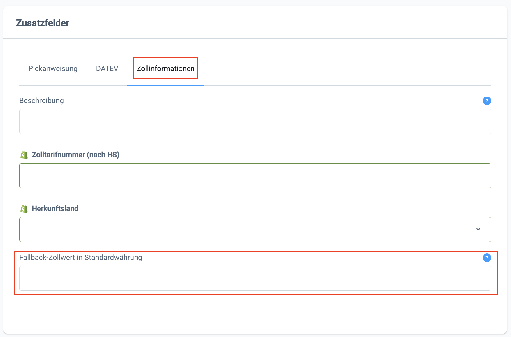 Die Felder Gewicht, Zolltarifnummer und Herkunftsland sind sowohl in Shopify als auch in Pickware verfügbar und sind standardmäßig im Produktimport enthalten.