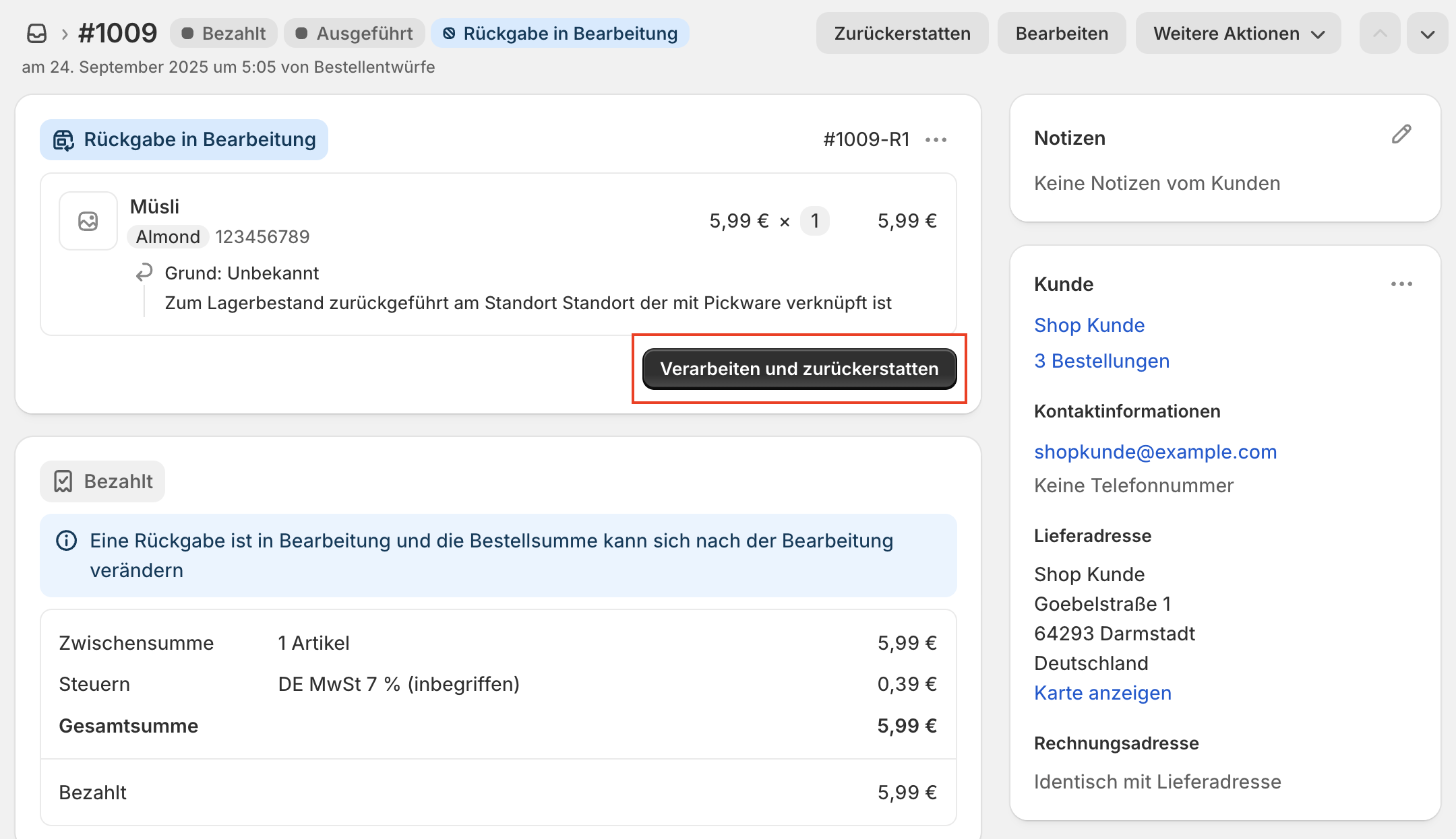 In Shopify oder im Retourenportal kannst du nun die Rückerstattung veranlassen. Öffne dazu die Bestellung in Shopify und klicke auf Verarbeiten und zurückerstatten.