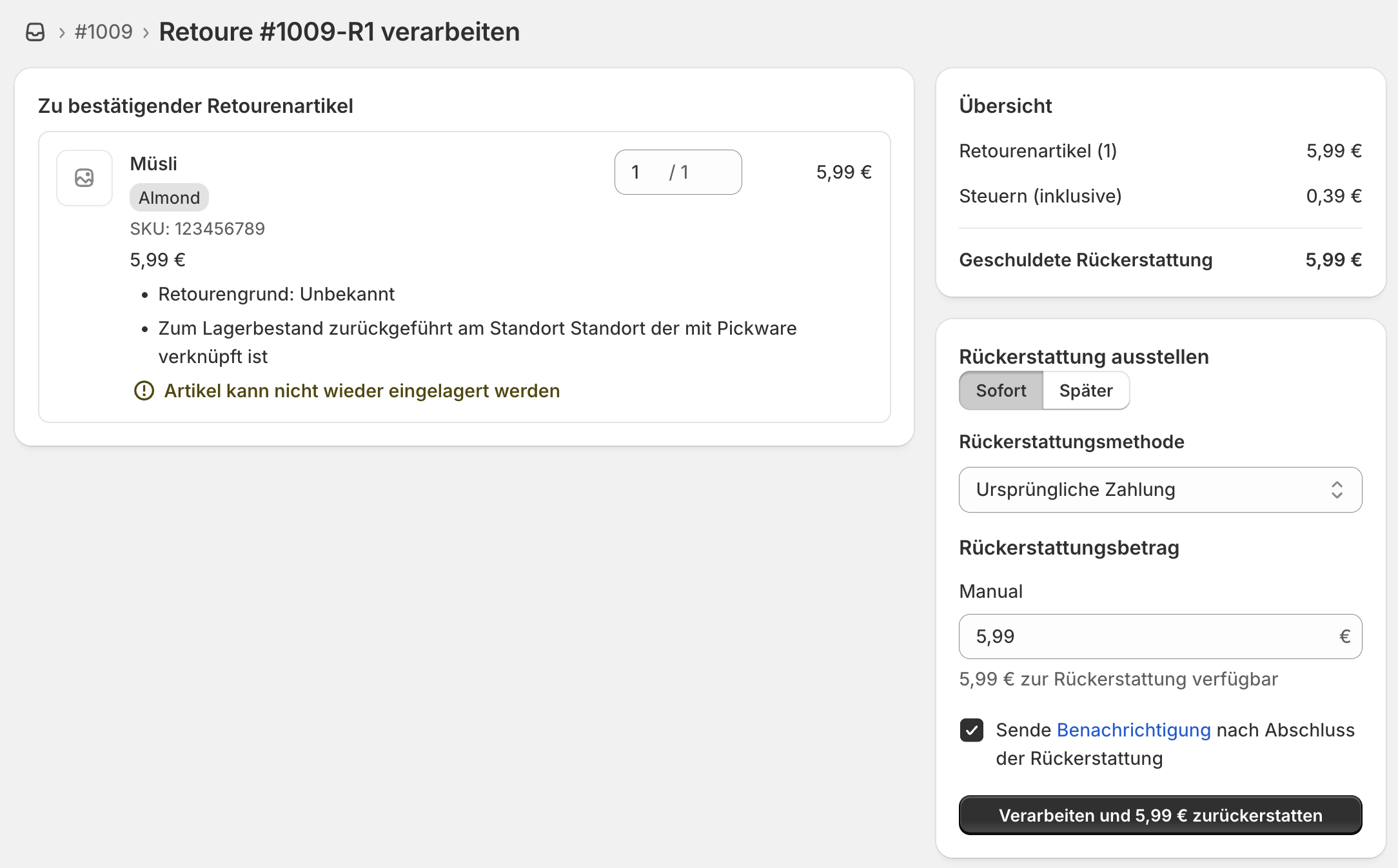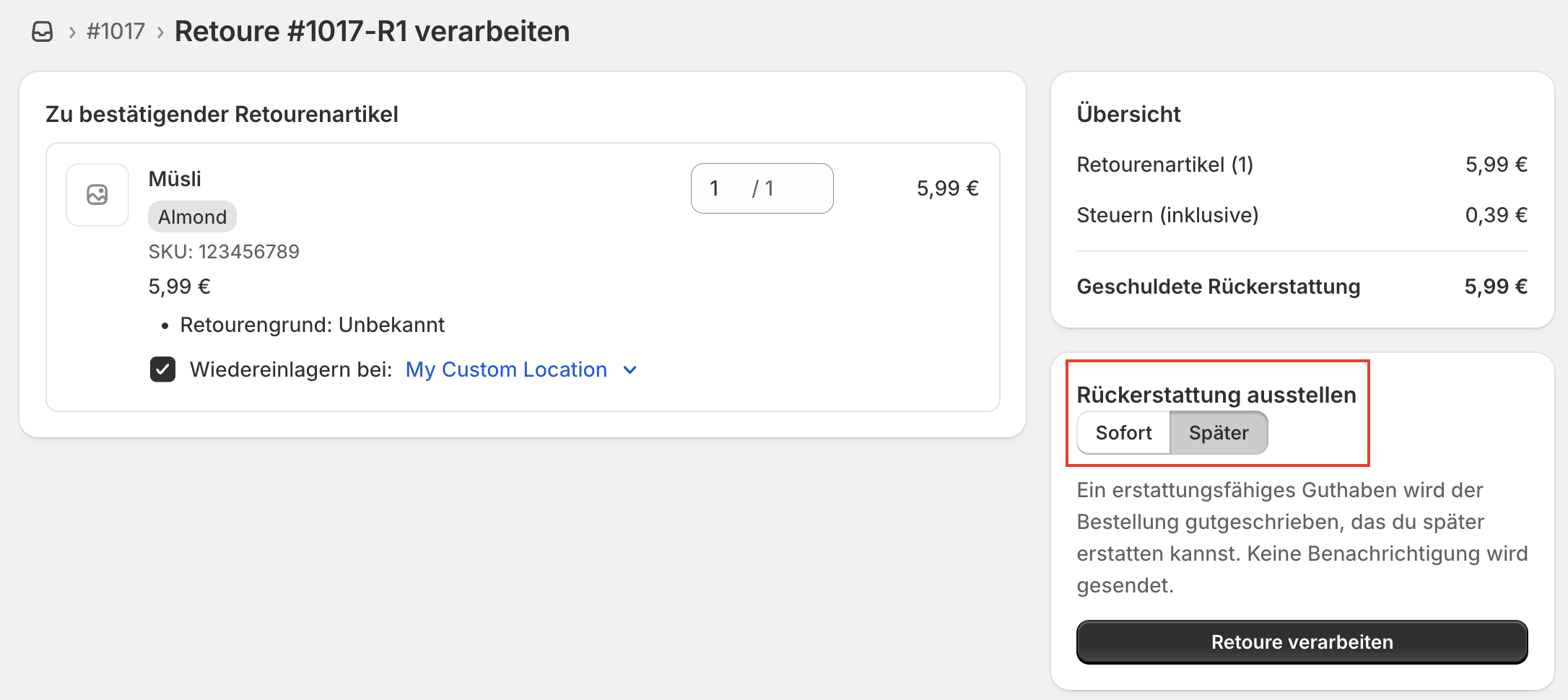 Wenn du die Rückerstattung zu einem späteren Zeitpunkt durchführen möchtest, wähle unten rechts die entsprechende Option aus und klicke dann auf Retoure verarbeiten.
