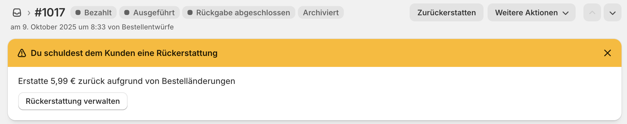 Der Zahlungsstatus deiner Retoure kann nicht in Pickware sondern nur in Shopify direkt bearbeitet werden. Die Statusänderungen werden anschließend auch nach Pickware übertragen. Ebenso kann auch die Rückererstattung nur in Shopify durchgeführt werden.