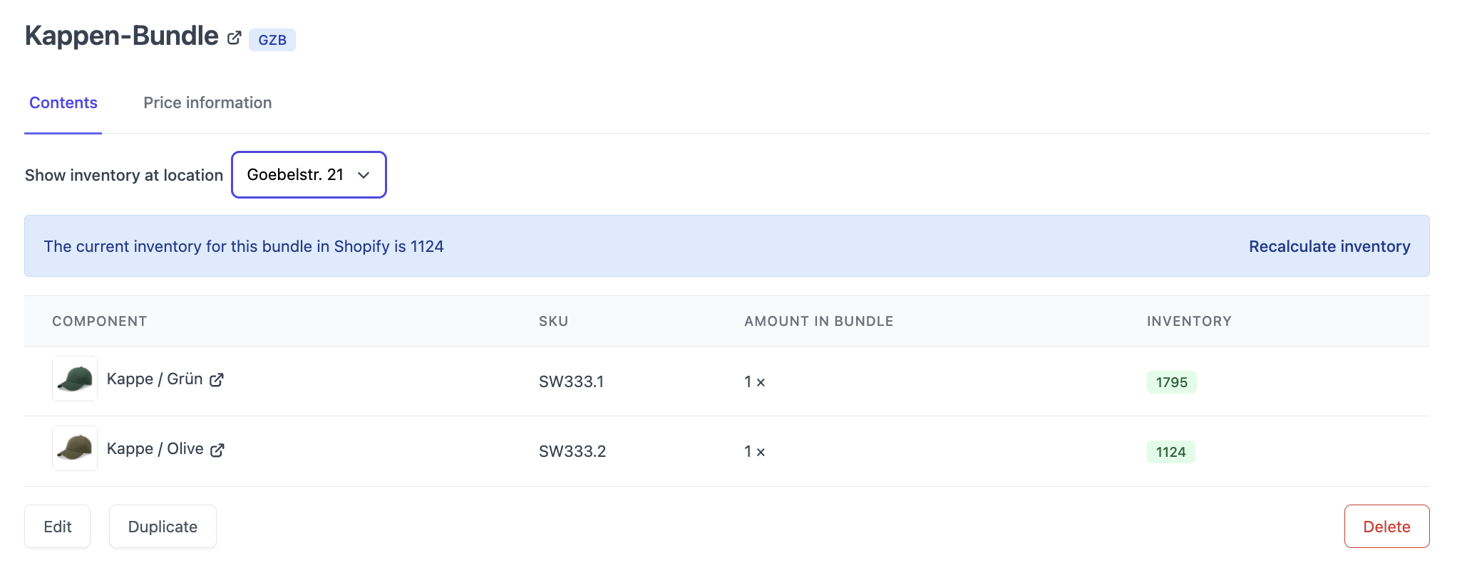 Sobald sich der Bestand eines der zugeordneten Bundle-Children in Shopify ändert, aktualisiert die Bundles.app automatisch den Bestand des Bundle-Parents. Geht also z. B. ein Wareneingang über ein Bundle-Child in Pickware ein und der Bestand wird zu Shopify übertragen, wird der Bestand des Bundle-Parents automatisch neu berechnet.