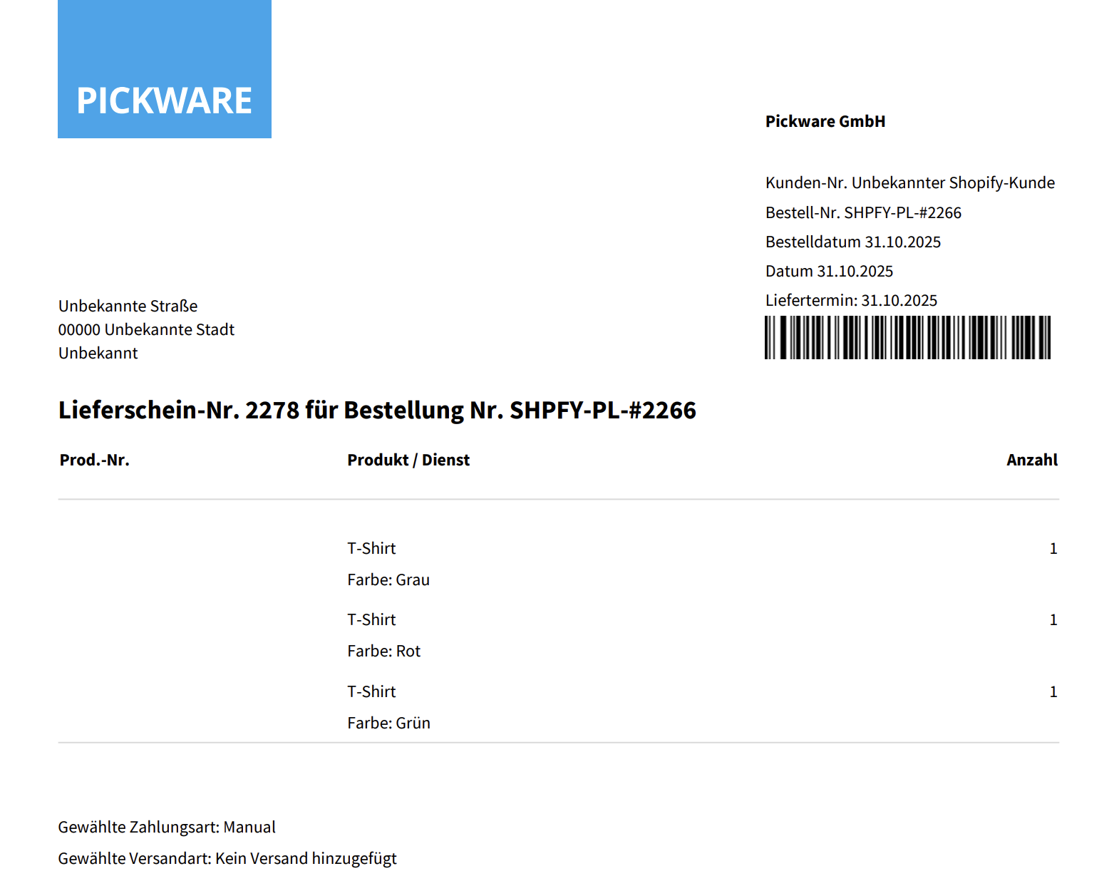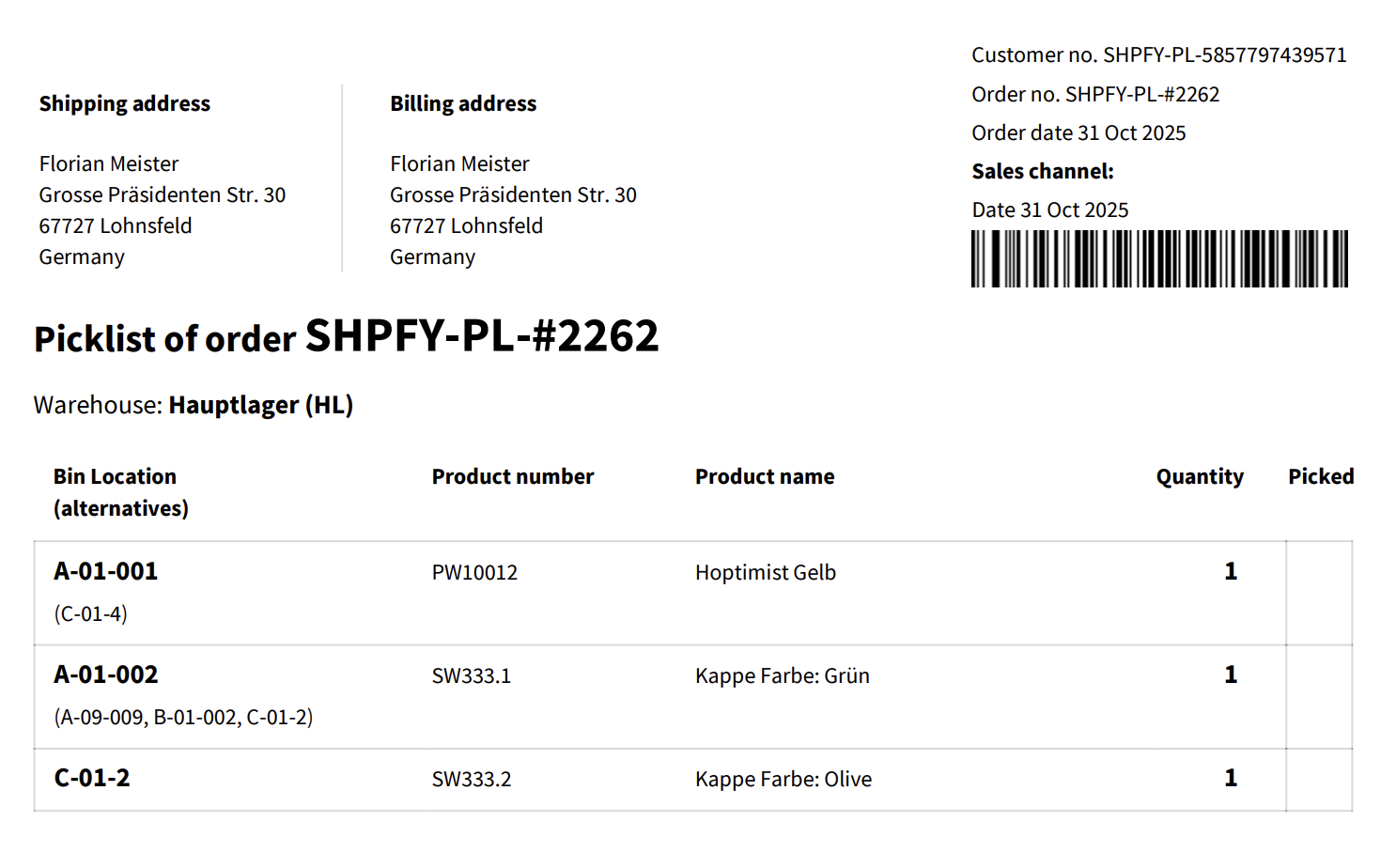 Nach diesem automatischen Bearbeiten der Bestellung wird sie automatisch in Pickware importiert. In Pickware werden neben dem Bundle-Parent die zugehörigen Bundle-Children (die enthaltenen Einzelprodukte) als verschachtelte Bestellpositionen importiert.