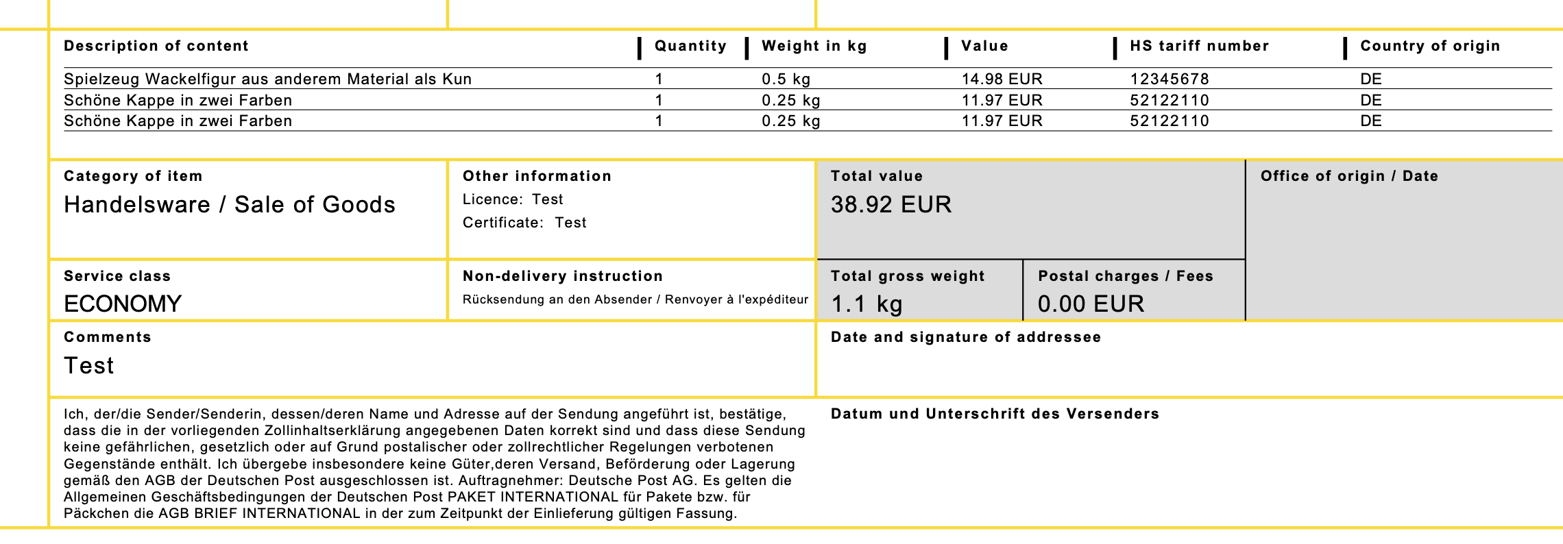 Musst du Exportdokumente erstellen, weil du in Drittländer (außerhalb der EU) versendest, werden nur die tatsächlich im Paket befindlichen Produkte auf der Zollinhaltserklärung oder der Handelsrechnung aufgeführt.