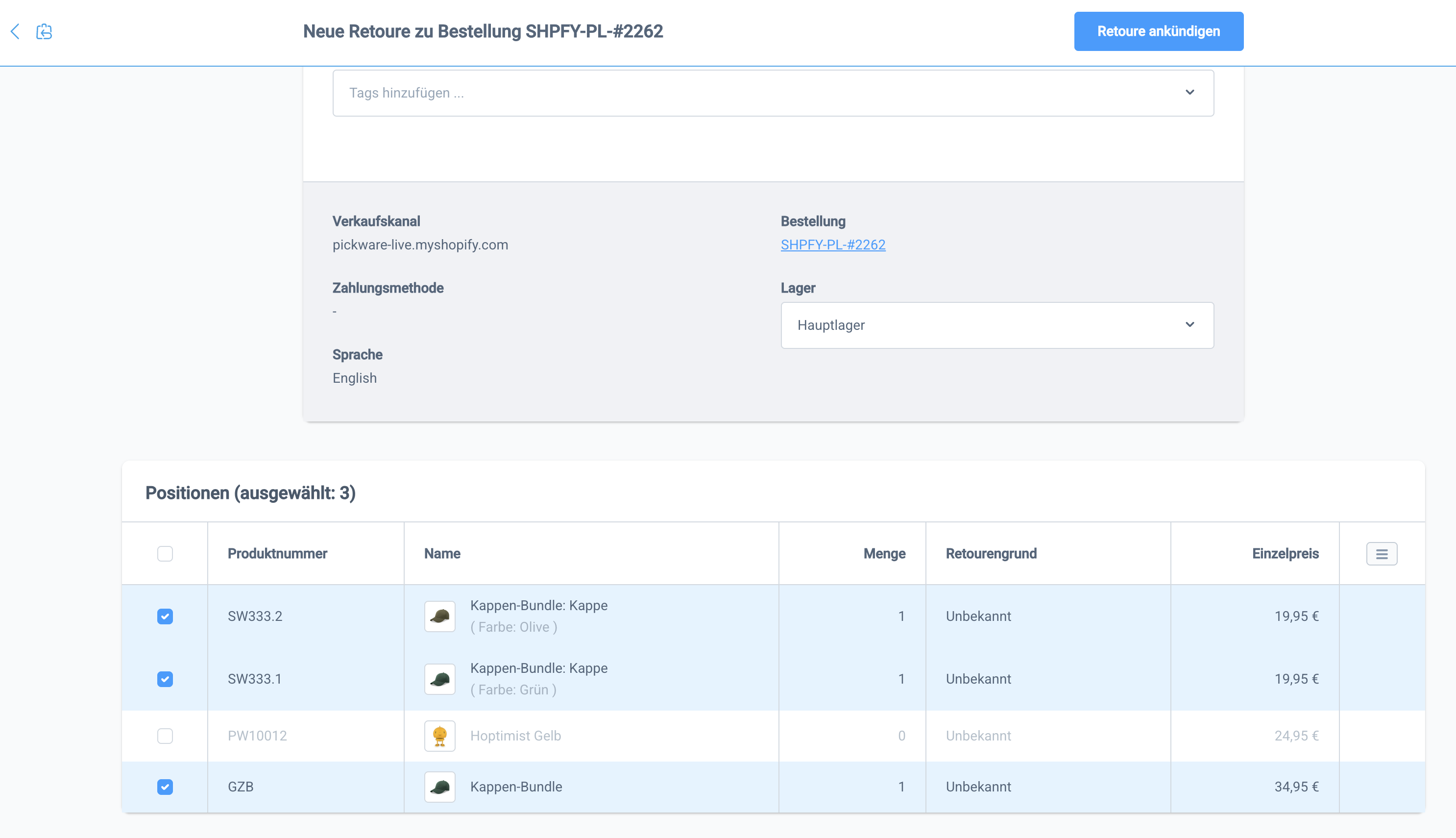 Retouren für Bundle-Produkte können ganz normal über Shopify oder Pickware angelegt werden. Alle Informationen zur allgemeinen Retourenbearbeitung mit Pickware findest du hier.