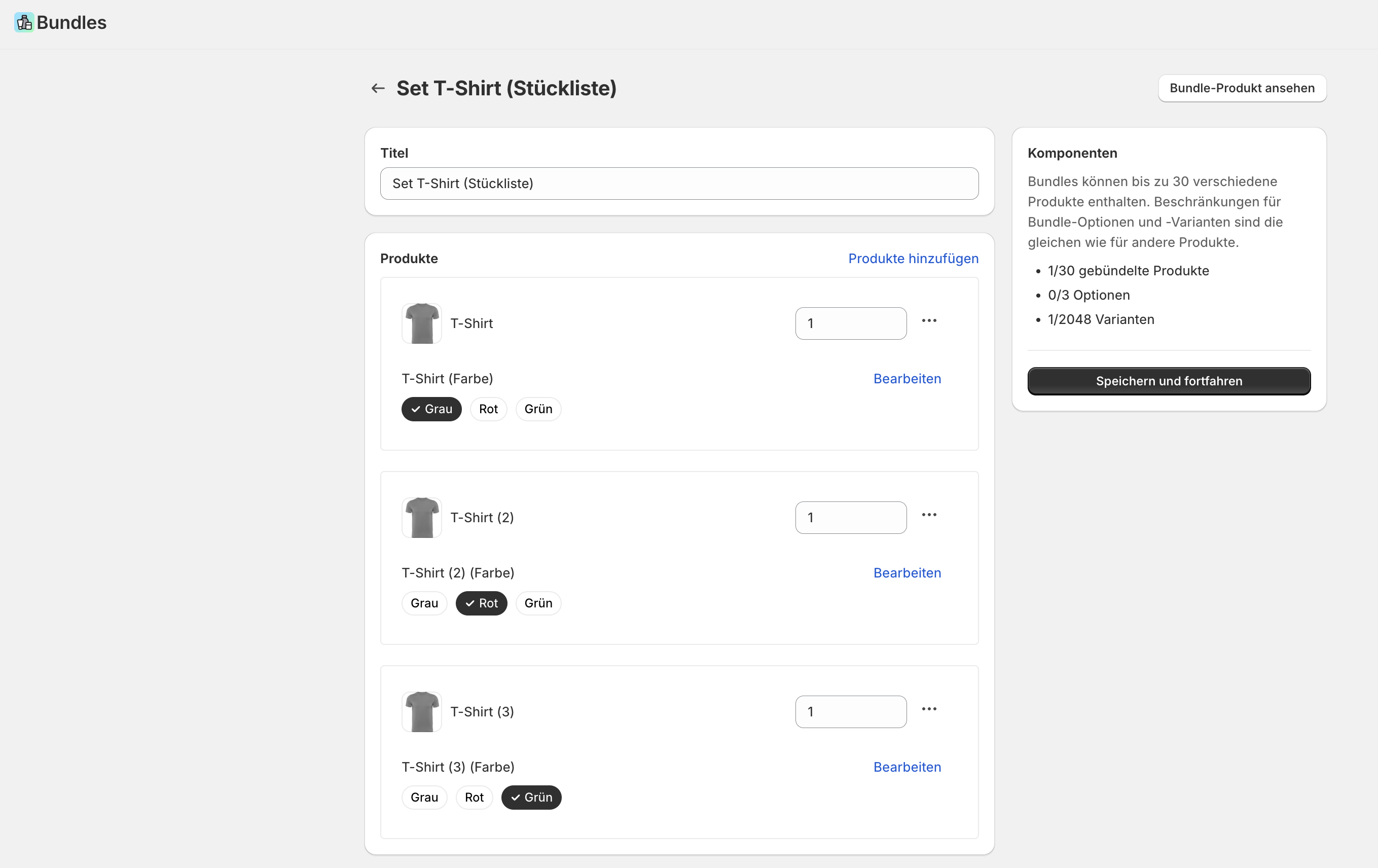 Auch die von Shopify selbst entwickelte Shopify Bundles App kann verwendet werden, um einfache Produktkombinationen anzubieten. Die Shopify Bundles App berechnet die Verfügbarkeit des Bundle-Parents ebenfalls automatisch. Die Bundle-Verwaltung erfolgt hier allerdings direkt in deiner Shopify-Admin. Daher muss die Shopify Bundles App nicht manuell von dir konfiguriert werden.