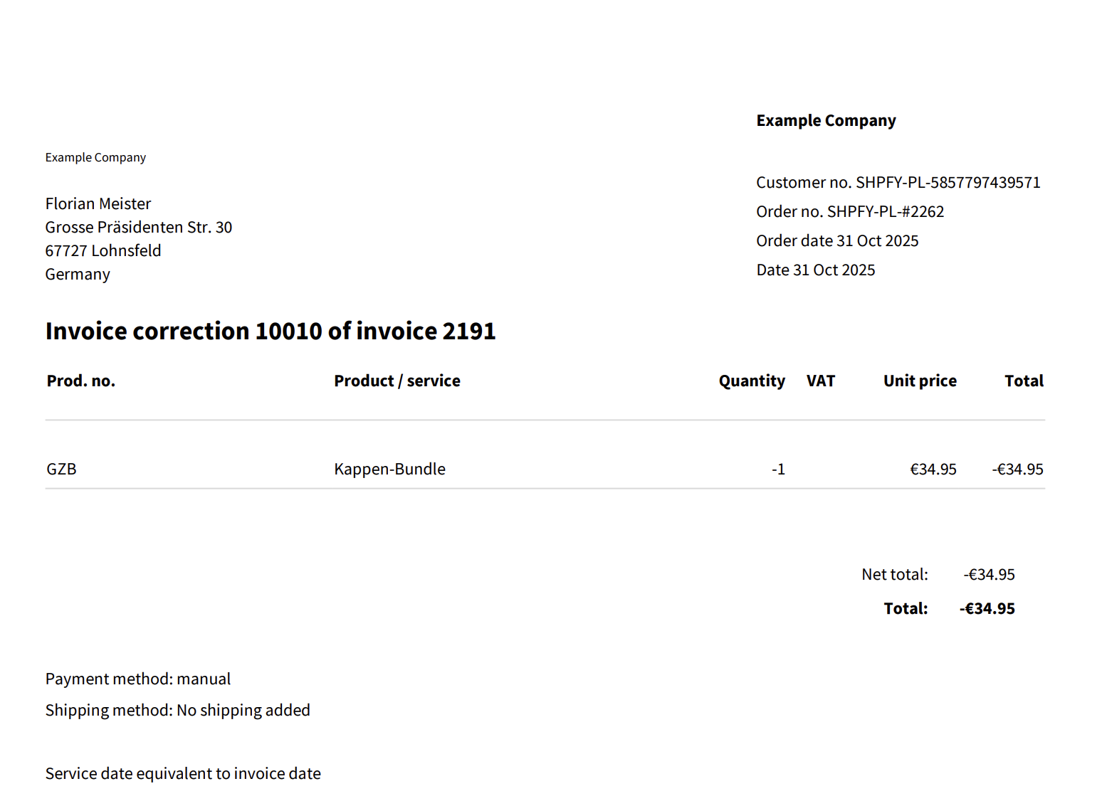 Nach dem Erstellen und Bearbeiten der Retoure kannst du wie gewohnt eine Rechnungskorrektur erstellen. Wird das Bundle vollständig retourniert, so erscheint wie gewohnt nur das Bundle-Parent auf der Rechnungskorrektur. Werden nur Bundle-Children retourniert, so werden diese nicht auf der Rechnungskorrektur angezeigt.