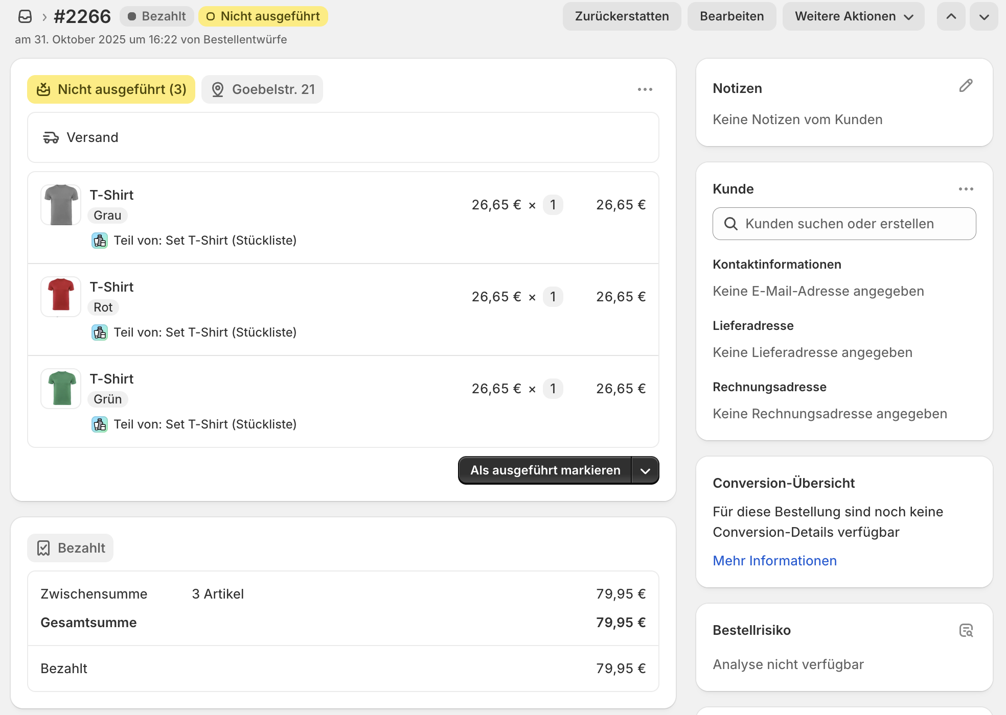Die Bestellung beinhaltet in Shopify lediglich die Bundle-Children. An jedem Bundle-Child gibt es einen Hinweis, zu welchem Bundle dieses gehört. Der Preis der einzelnen Bundle-Children wird automatisch so aufgeteilt, dass diese in Summe dem Preis des Bundles entsprechen. Dieser Preis kann nicht beeinflusst werden.