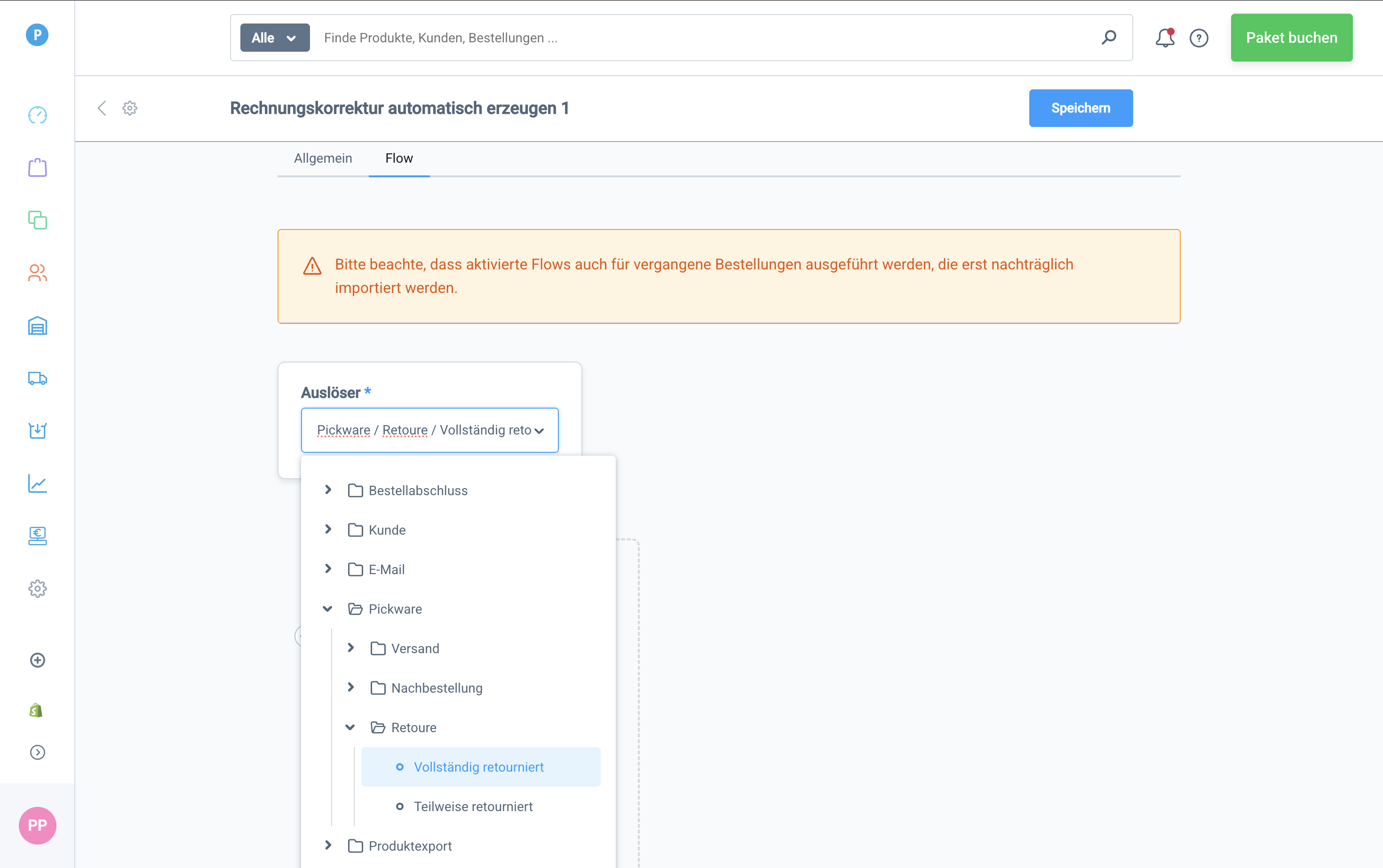 Wechsle als nächstes in den Tab Flow und wähle den Auslöser Vollständig retourniert bzw. Teilweise retourniert.