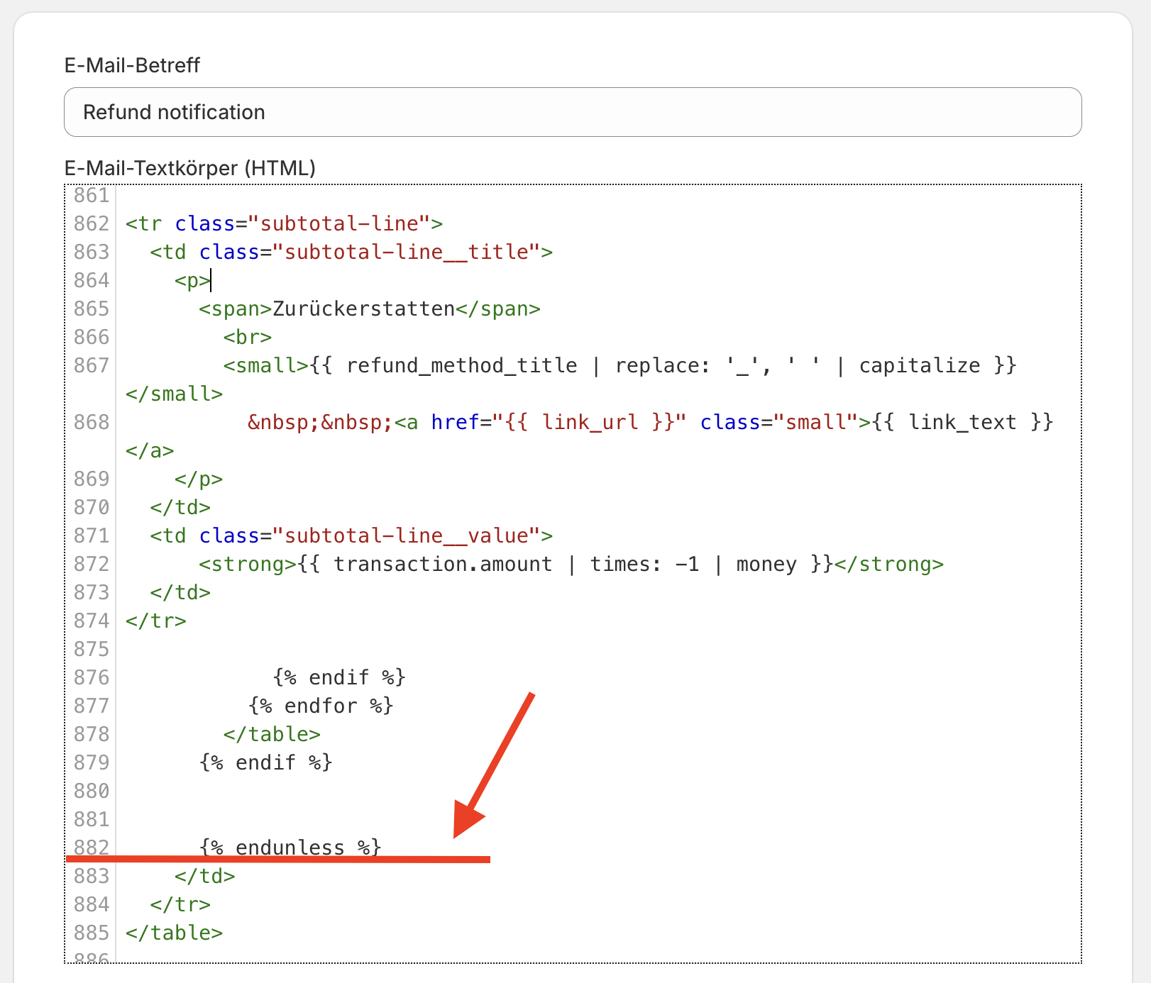 Suche nach folgender Stelle im Code. Die Stelle sollte sich relativ weit unten in der E-Mail-Vorlage befinden.