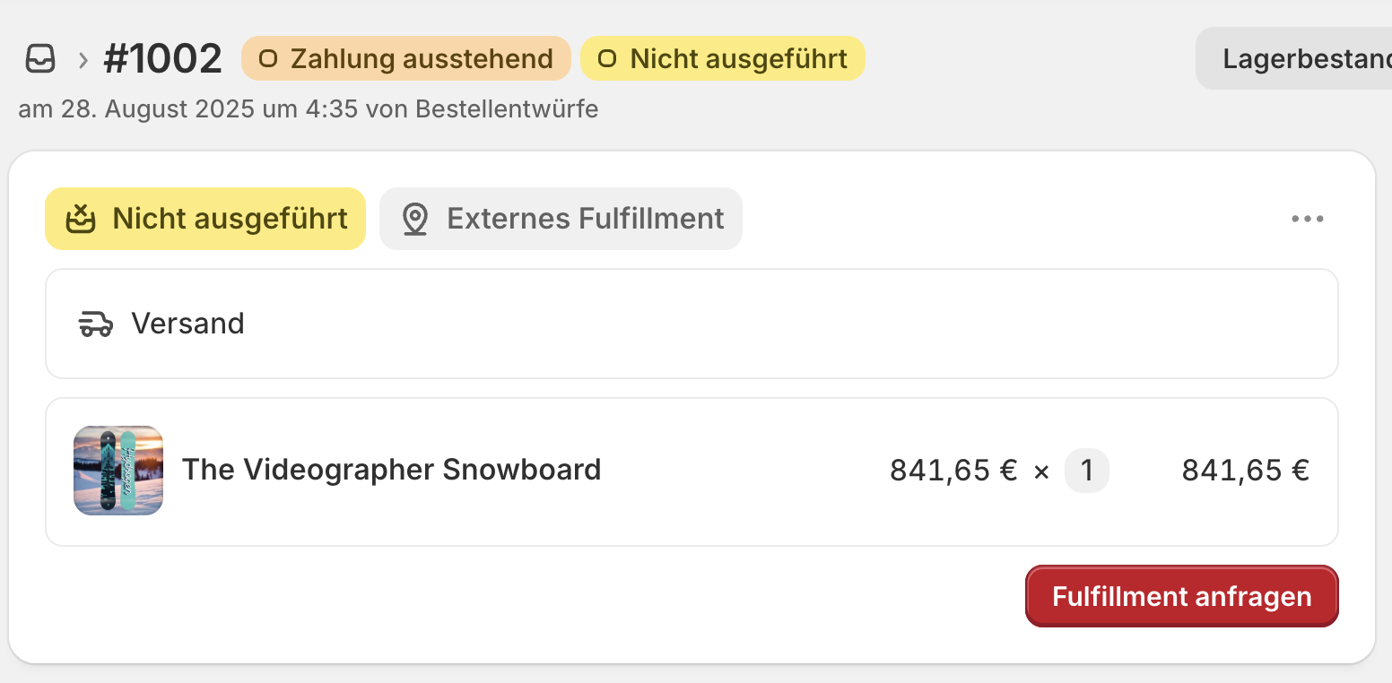 Wenn für das Produkt eine Bestellung eingeht, siehst du innerhalb der Bestellung die Option Fulfillment anfragen. Anhand des hellgrauen Labels erkennst du, welcher Fulfillment-Dienstleister für das Produkt hinterlegt ist.