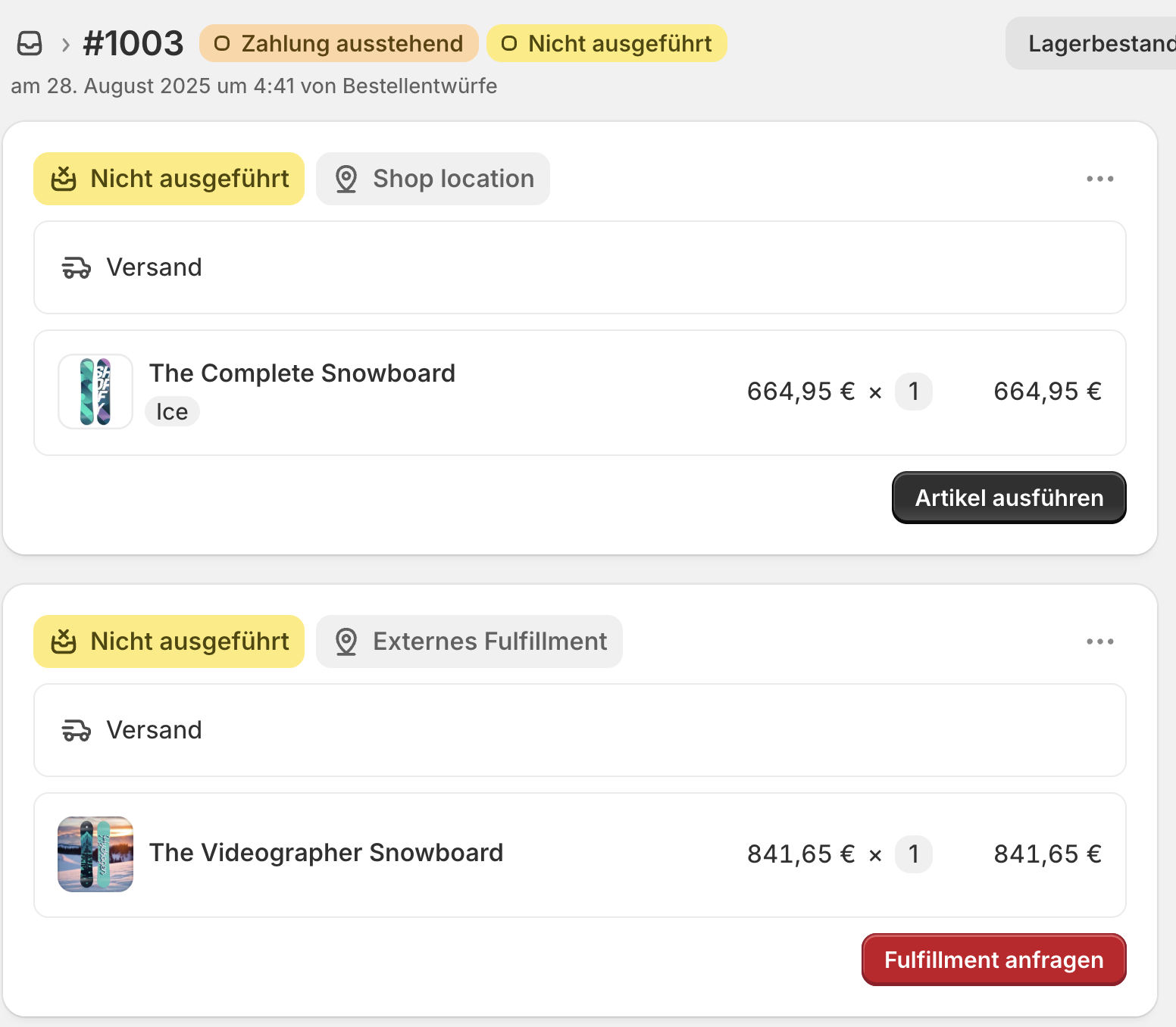 In Shopify teilt sich deine Bestellung in diesem Fall in zwei Abschnitte, einen für die Produkte, die du selbst versendest und einen anderen für die extern fulfillten Produkte. Für letztere kannst du wie oben beschrieben das Fulfillment über die entsprechende Schaltfläche anfragen. Die regulären Produkte können auch ganz regulär per WMS App oder Pickware Admin kommissioniert werden.