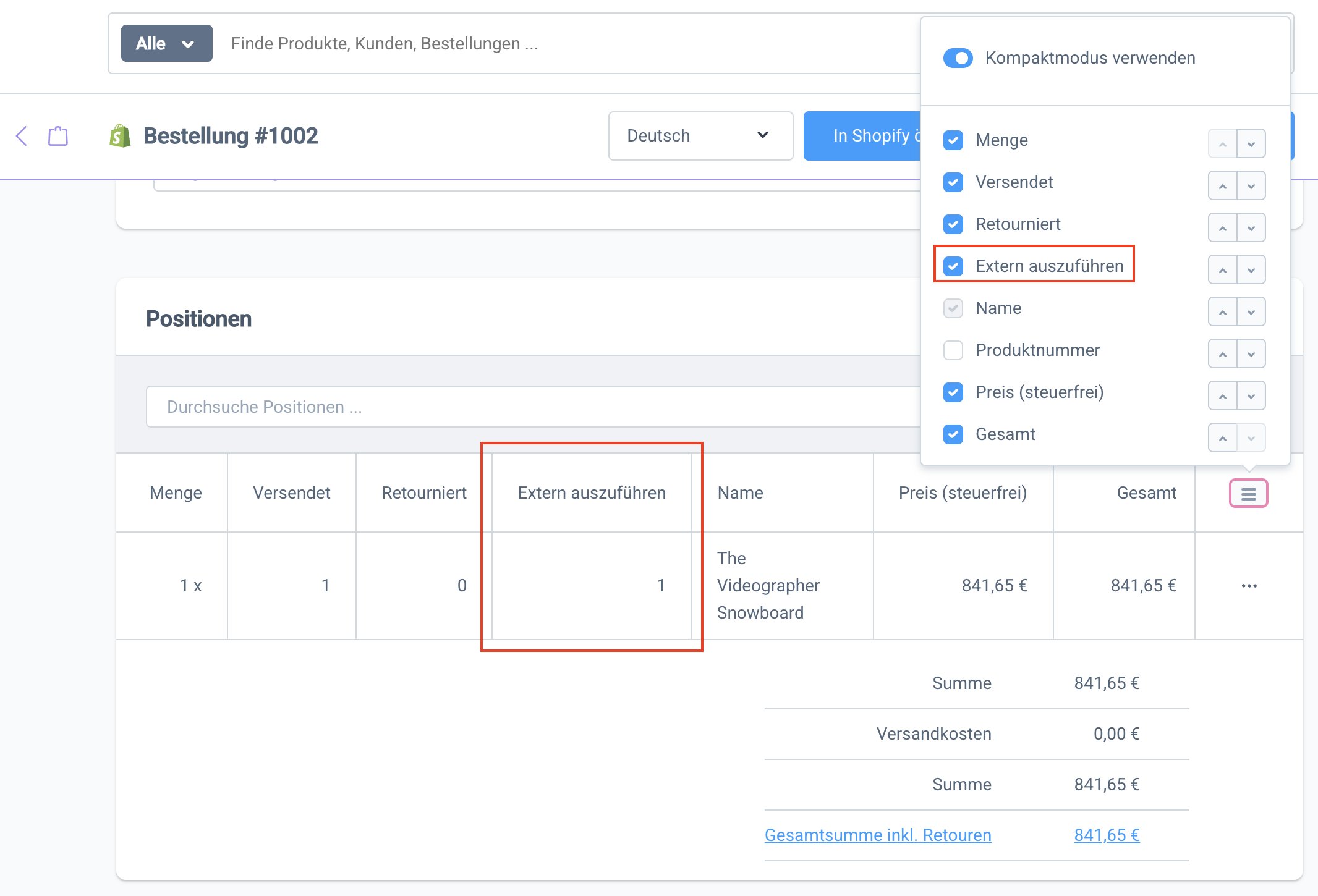 In den Bestellungsdetails im Abschnitt Positionen kannst du dir die zugehörige Spalte Extern auszuführen einblenden lassen.