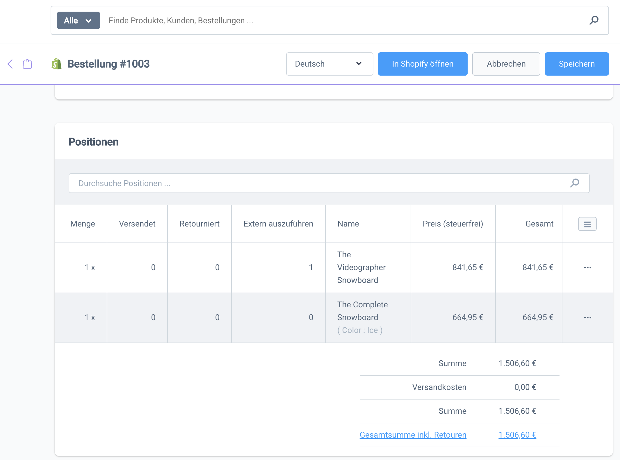 Bestellungen und Bestellpositionen mit externem Fulfillment erscheinen weiterhin in deiner Pickware Admin, wobei die betreffenden Produkte in den Bestellungsdetails als Extern auszuführen markiert werden. Sie reservieren keinen Bestand, tauchen nicht bei der Kommissionierung auf und werden beim Versenden in Pickware auch nicht in Shopify ausgeführt.