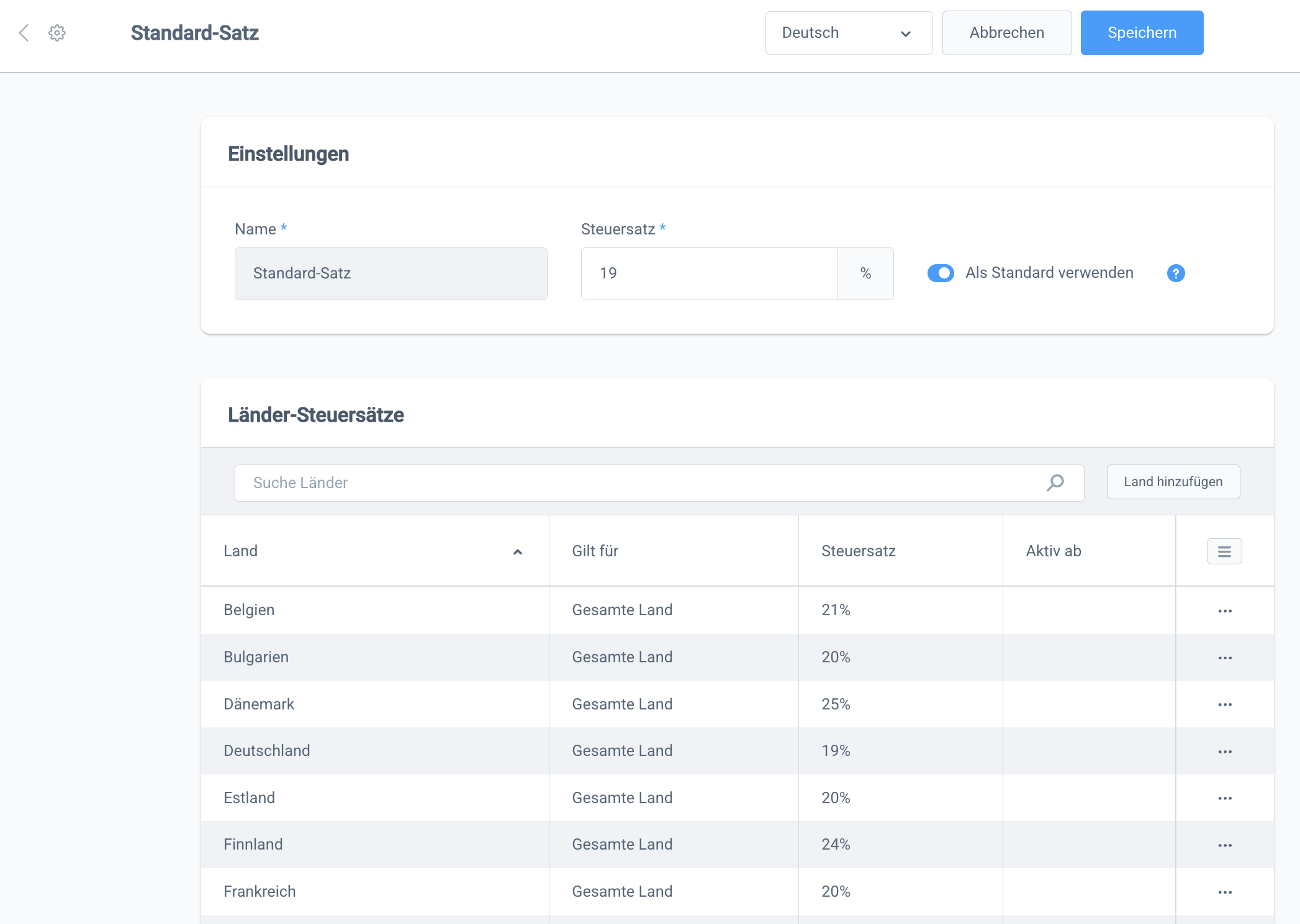 Über einen Klick in die entsprechende Zeile kannst du je Land einen Standardsteuersatz, einen ermäßigten Satz sowie einen stark ermäßigten Satz hinterlegen. Lege auf diese Weise die gewünschten Steuersätze an.