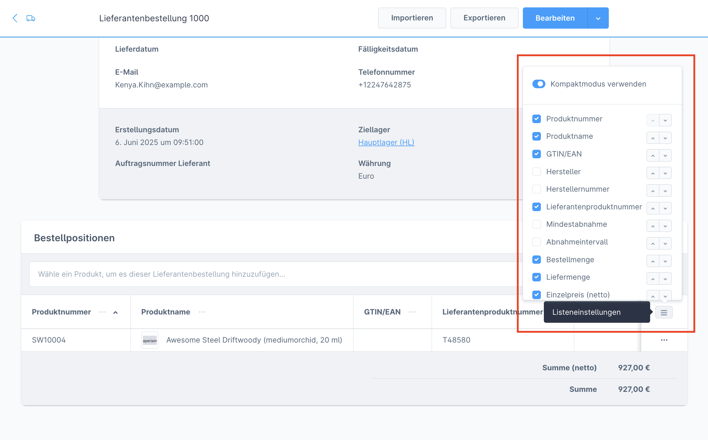 Für den Import bzw. Export der Lieferantenbestellung können die Spalten variabel eingestellt werden. Gehe hierfür in die Lieferantenbestellung und klicke unter Bestellpositionen auf Listeneinstellungen. Hier kannst du die Reihenfolge der Spalten einstellen. Ebenso kannst du einstellen, welche Spalten beim Export bzw in der Bestellübersicht angezeigt werden sollen.
