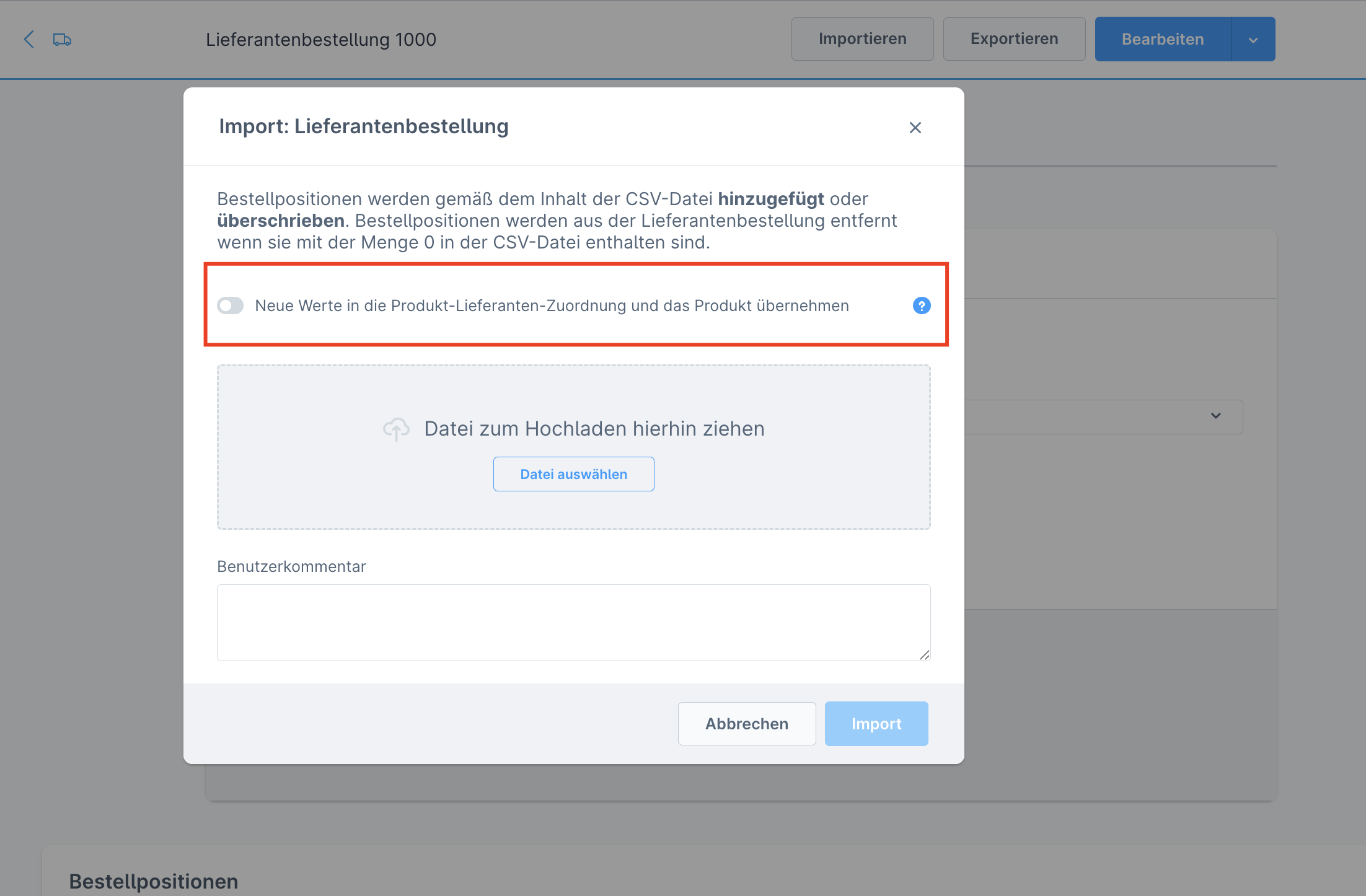 Durch den Import der CSV-Datei für Lieferantenbestellungen kannst du die Details der Produkt-Lieferanten-Zuornung überschreiben, sofern die Daten der CSV-Datei von den bisherigen Werten abweichen. Dafür kannst du unter Importieren den Toggle Neue Werte in die Produkt-Lieferanten-Zuordnung und das Produkt übernehmen aktivieren.