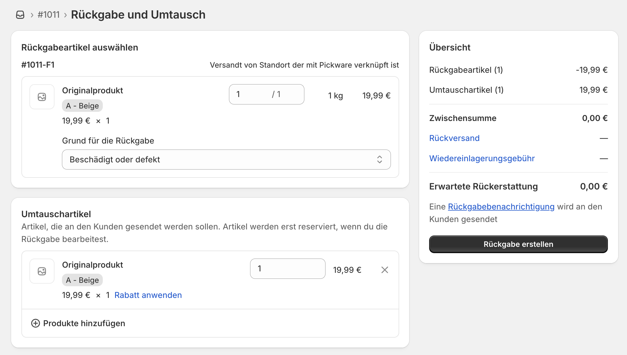 Im nächsten Schritt kann die Rückgabe erstellt und das Umtauschprodukt ausgeführt werden.