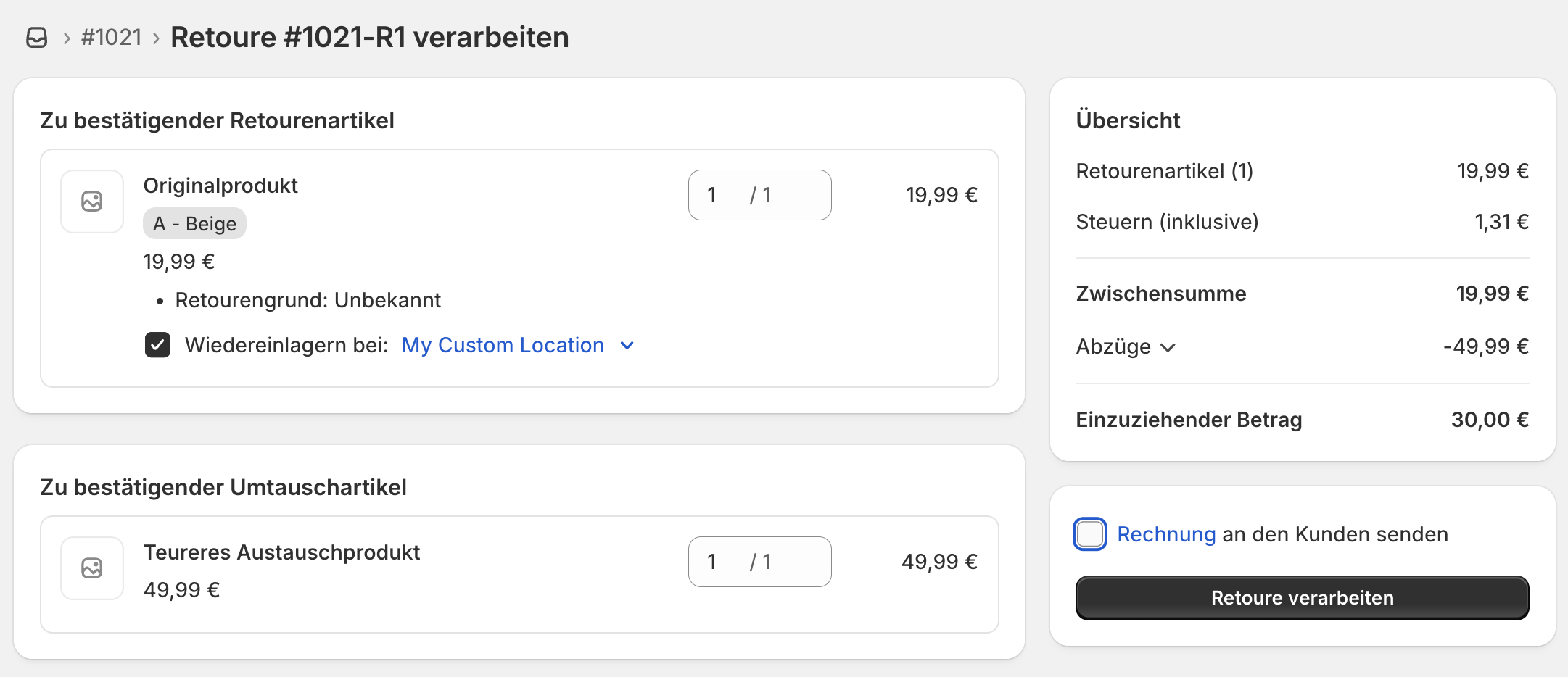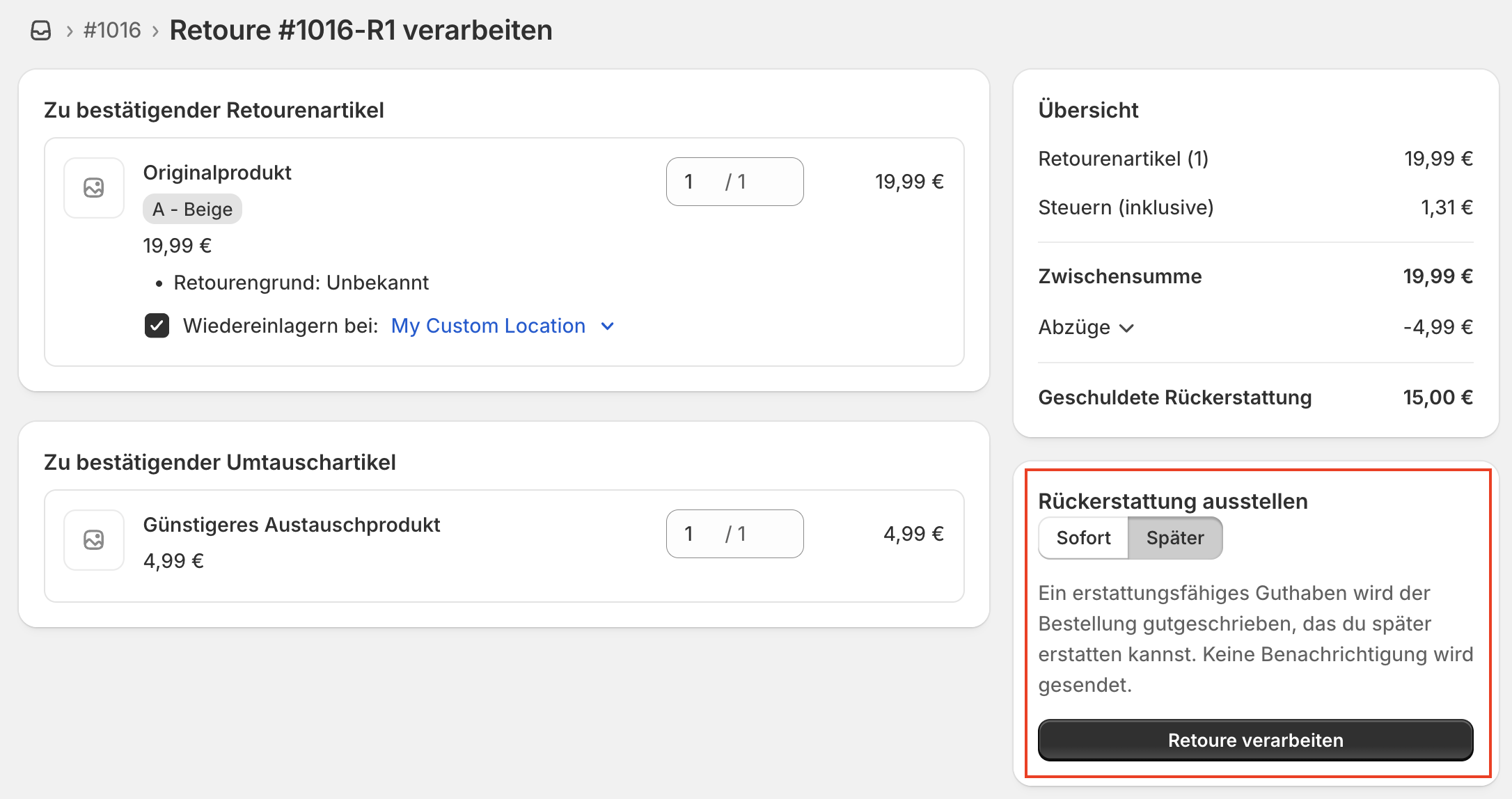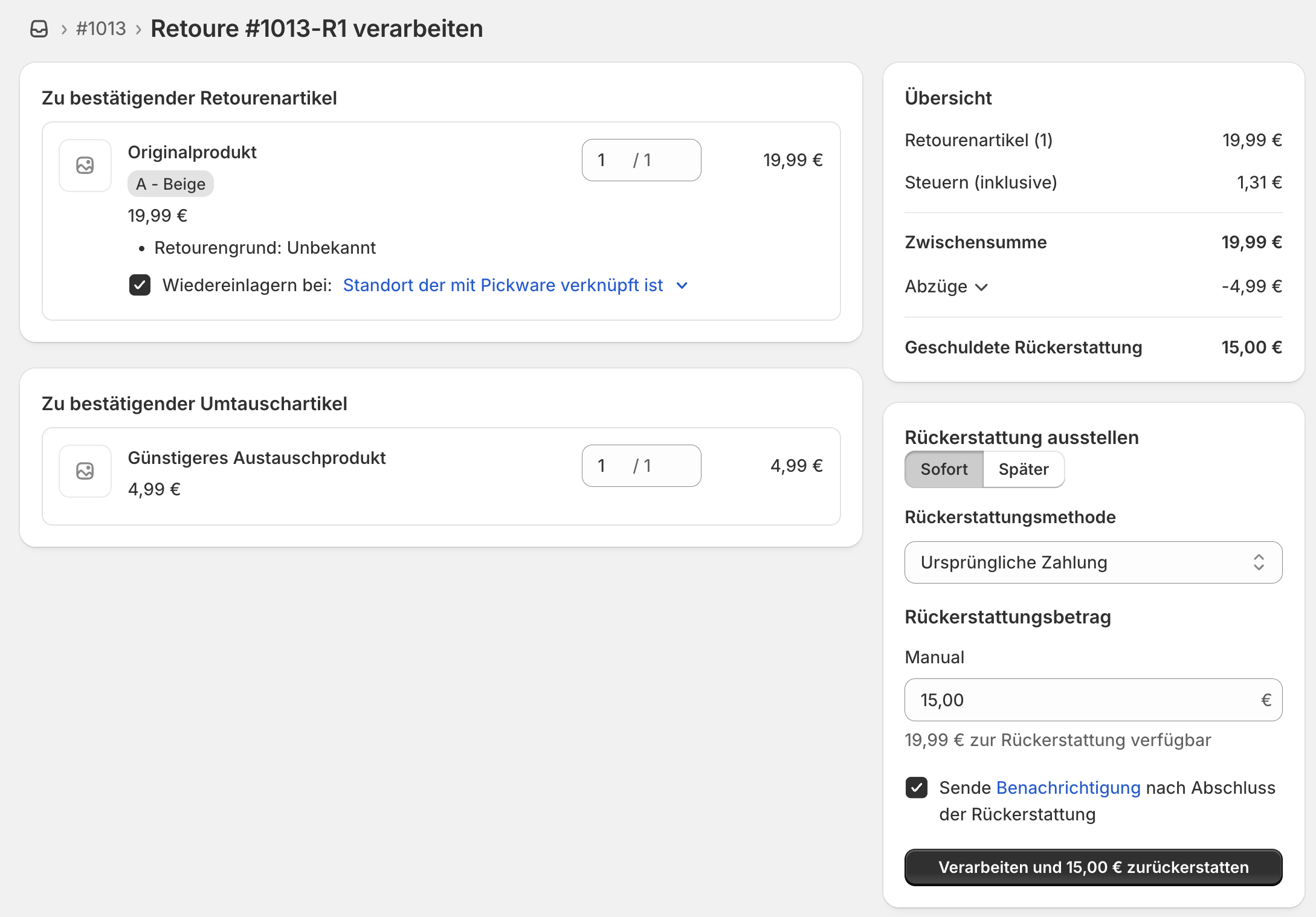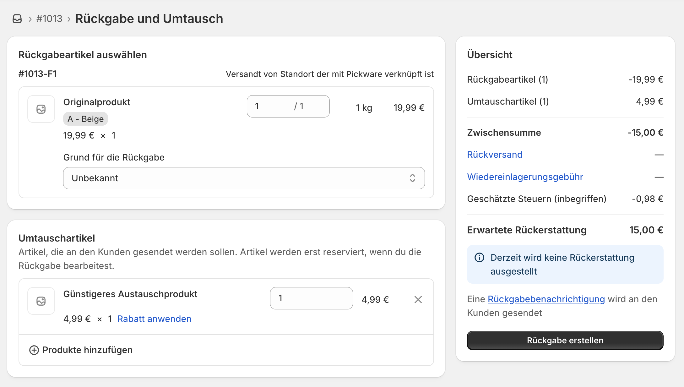 Hier wurde für den Umtausch ein anderes, günstigeres Produkt ausgewählt. Dadurch ergibt sich ein Differenzbetrag, welchen du dem Kunden erstatten musst.