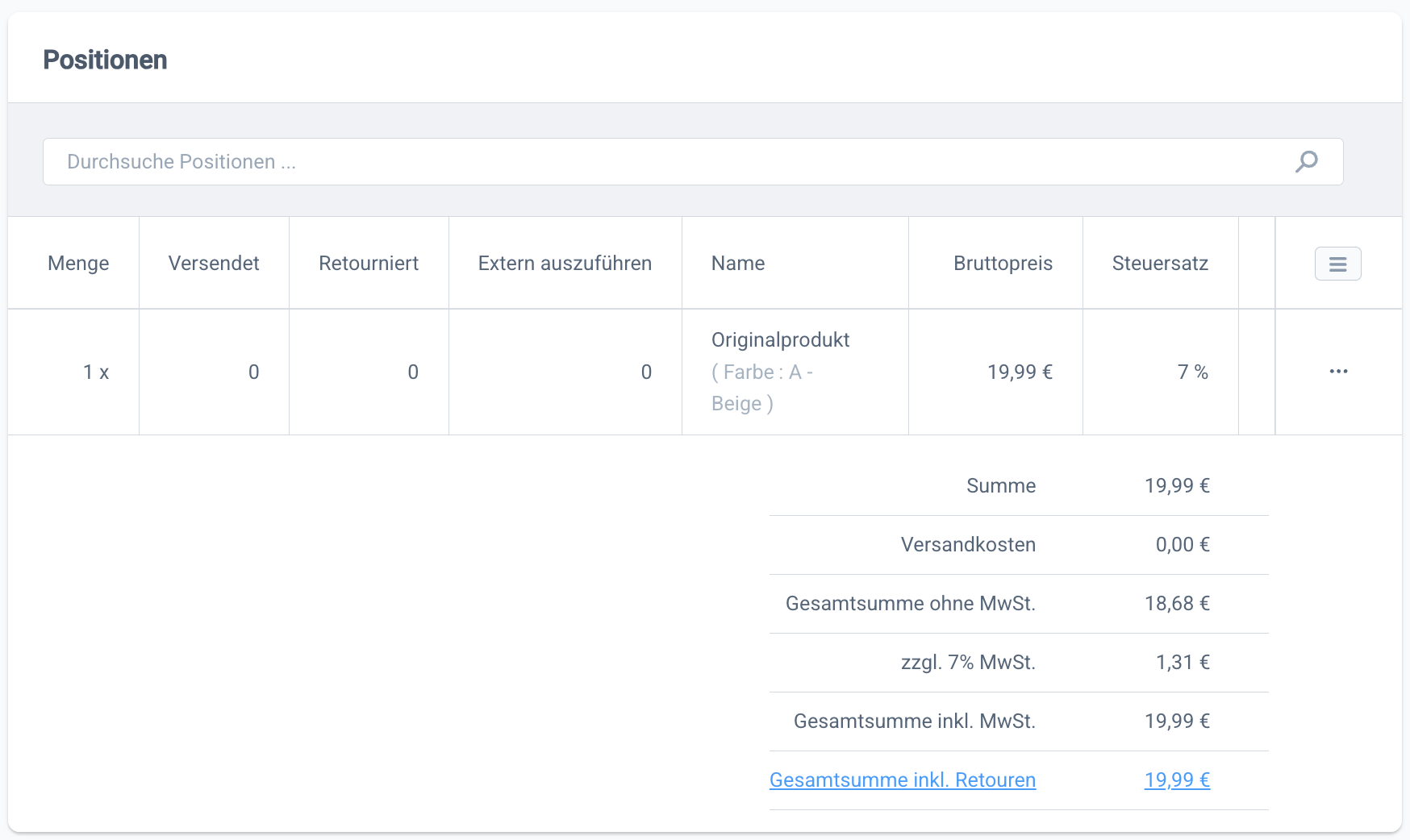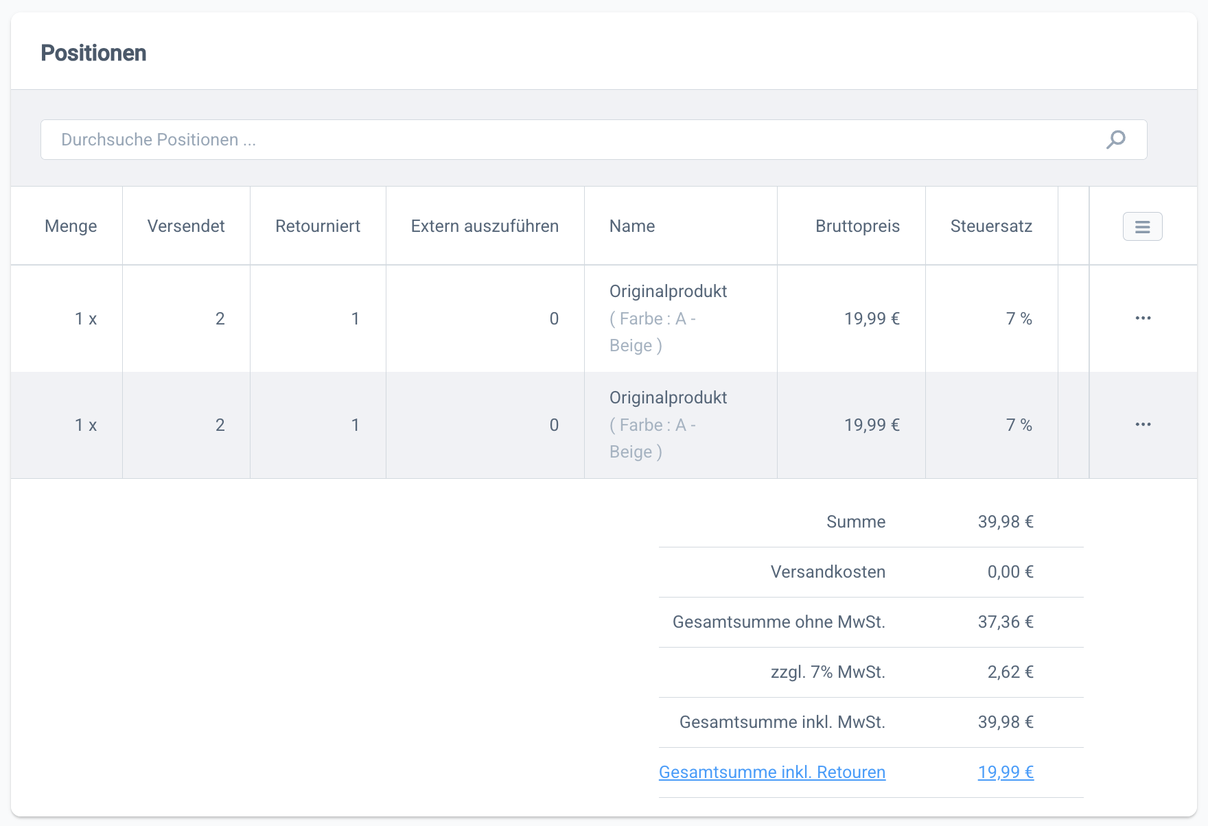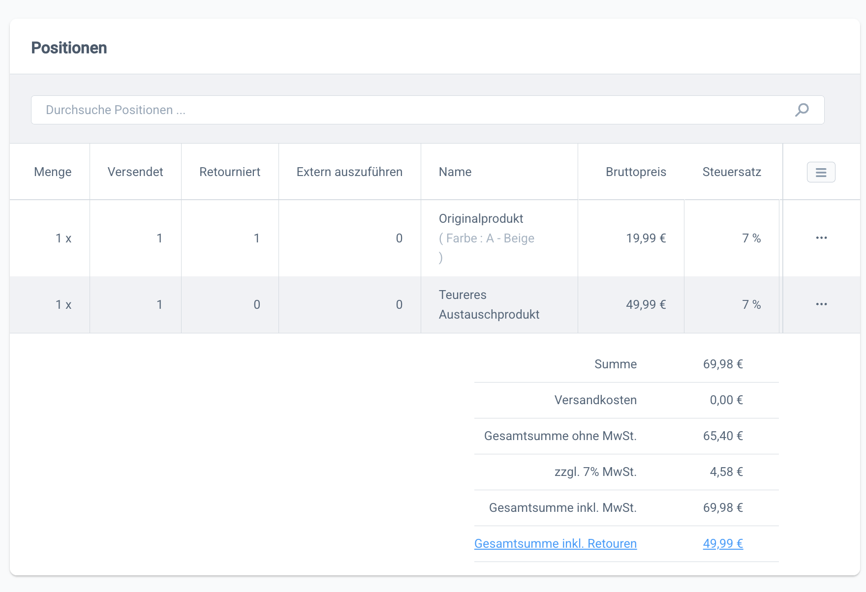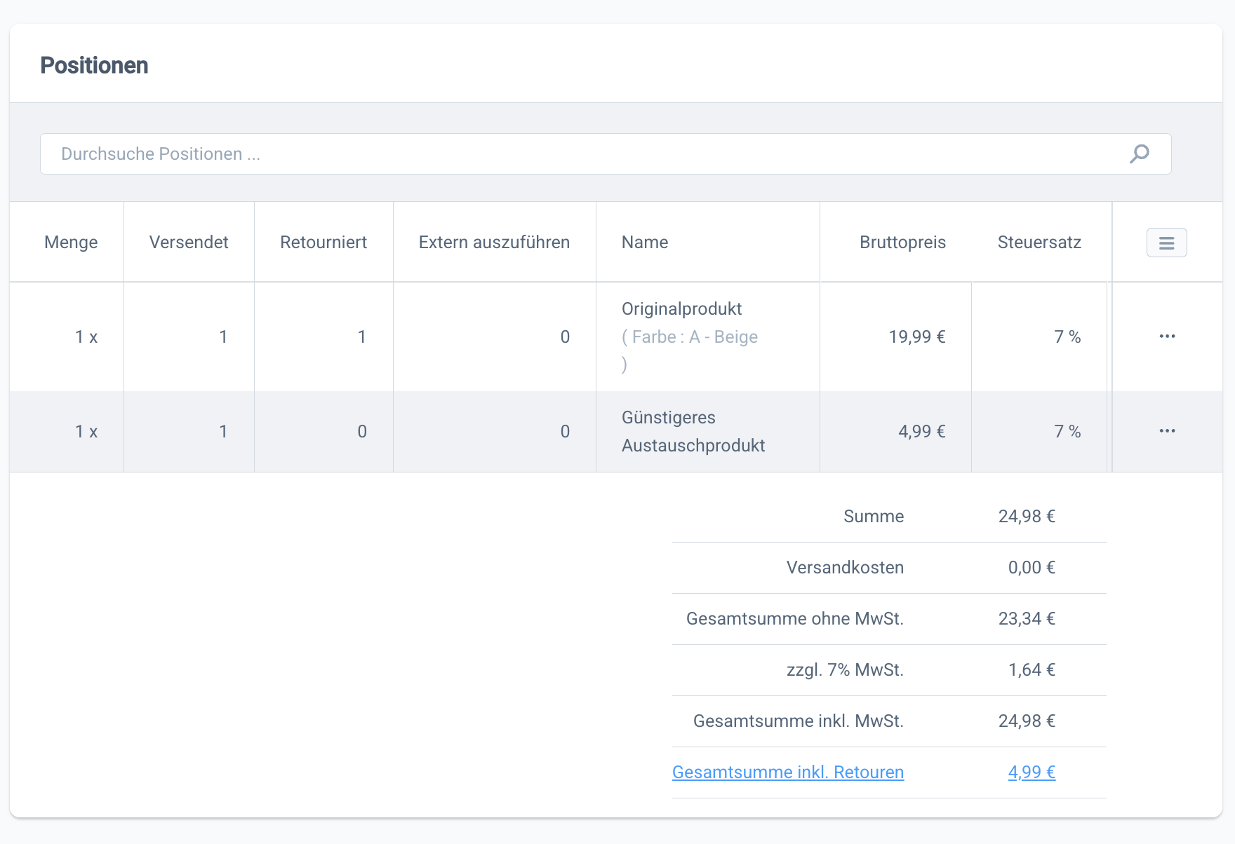 Hier wurde für den Umtausch ein anderes, günstigeres Produkt ausgewählt. Dadurch ergibt sich ein Differenzbetrag, welchen du dem Kunden erstatten musst.