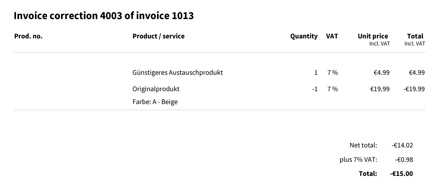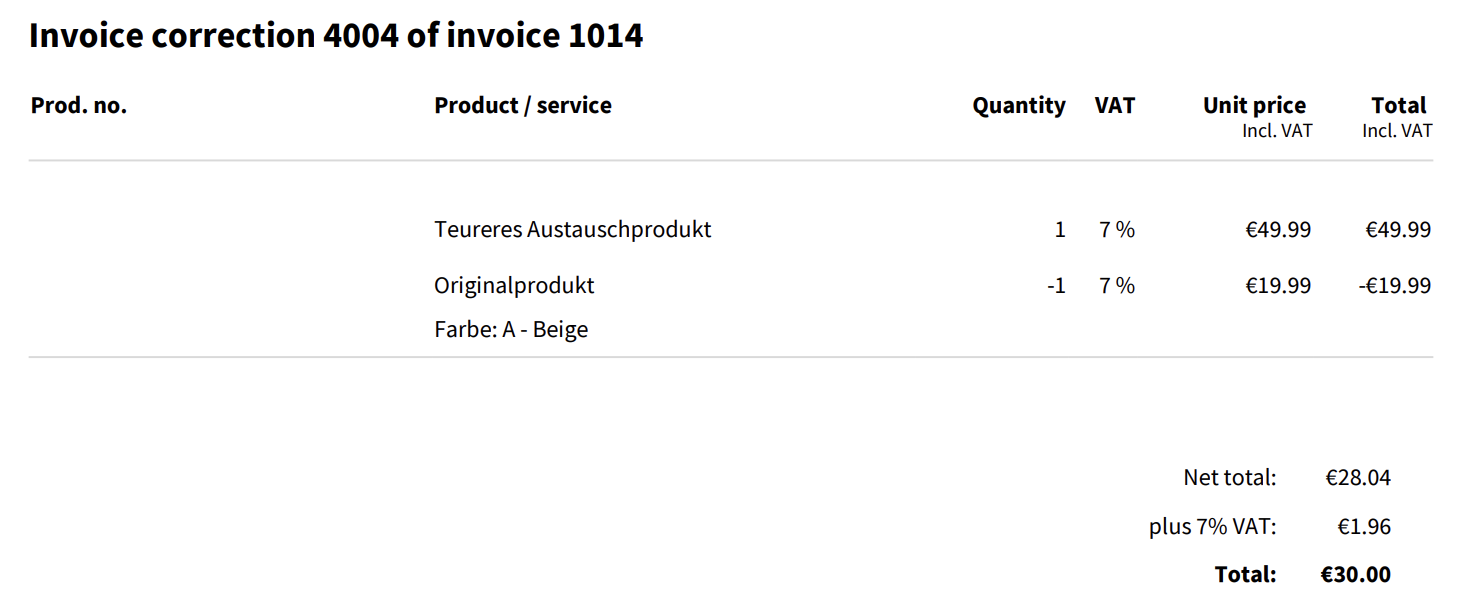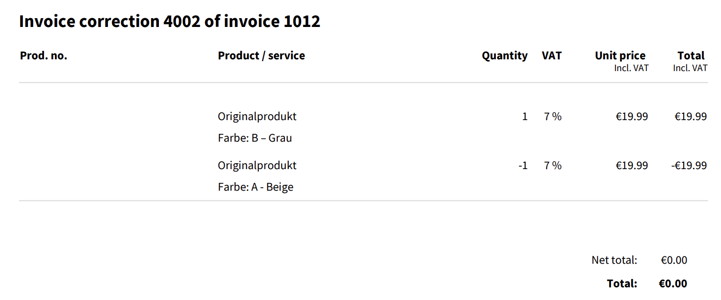 Da du in diesem Fall das Produkt mit dem gleichen Produkt ersetzt und sich somit weder eine Änderung an den Bestellpositionen noch am Rechnungsbetrag ergibt, ist keine Rechnungskorrektur notwendig.