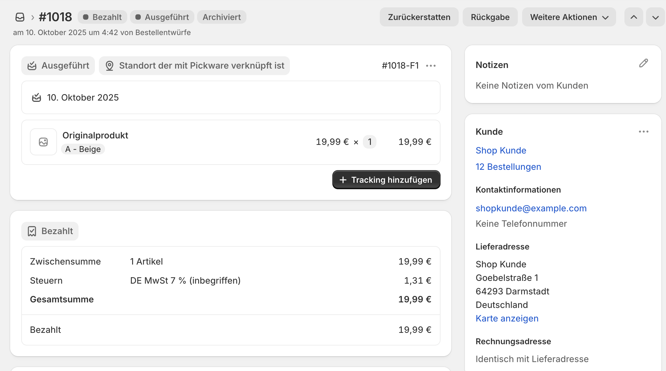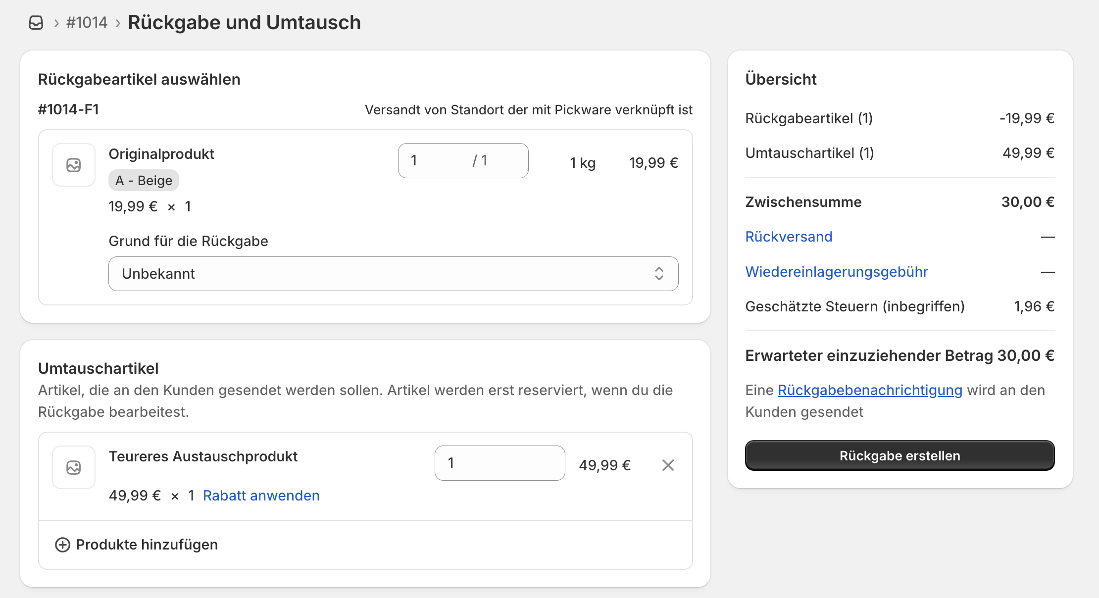 Retouren und Umtausche kannst du direkt in der Shopify Admin erledigen. Die detaillierte Anleitung dazu findest du im Shopify Helpcenter. Alle Änderungen werden in Echtzeit an Pickware übertragen, sodass du die passenden Rechnungskorrekturen erstellen kannst. Dieser Beitrag zeigt verschiedene Szenarien von Umtauschen und deren Darstellung in der Pickware Admin sowie auf der Rechnungskorrektur anhand eines konkreten Beispiels.