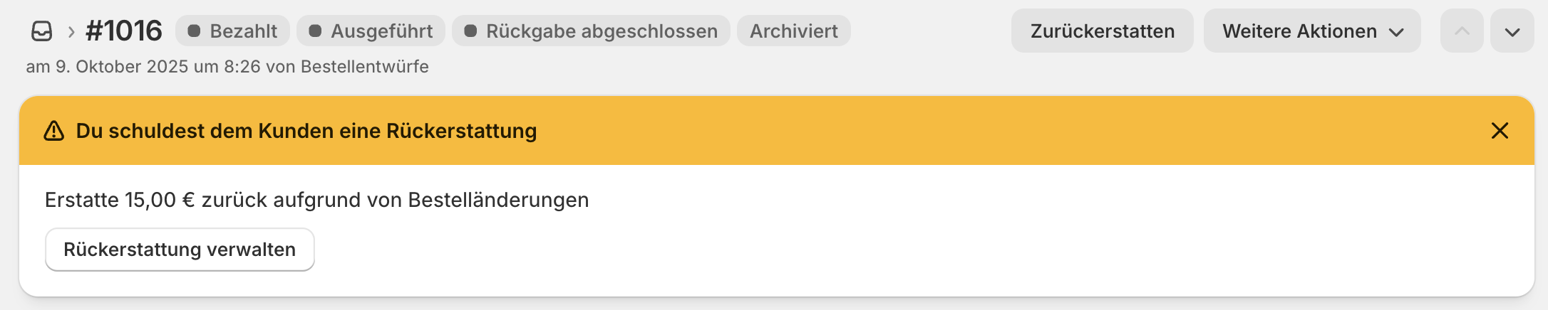 Sofern du die Rückerstattung noch nicht durchgeführt hast, siehst du folgende Erinnerung, wenn du die Bestellung in Shopify öffnest.
