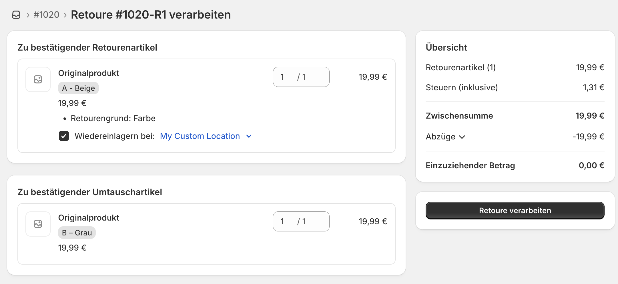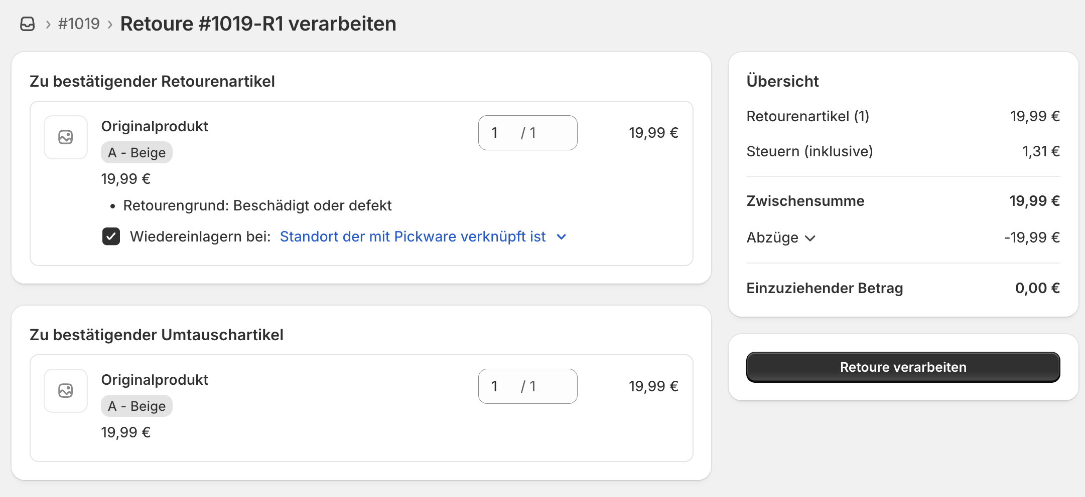 Dieses Szenario ist relevant, wenn das retournierte Produkt beispielsweise beschädigt ist und der Kunde eine Ersatzlieferung erhalten soll. Hier wurde für den Umtausch das gleiche Produkt in der gleichen Variante (Beige) ausgewählt.
