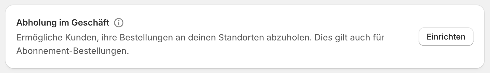 Zunächst muss die lokale Abholung in Shopify aktiviert werden. Navigiere dazu in deiner Shopify Admin zu Einstellungen → Versand und Zustellung → Abholung im Geschäft → Einrichten.