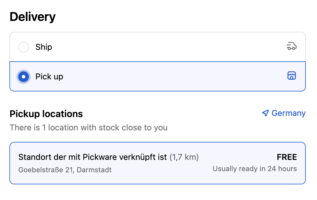 Beim Bestellabschluss kann nun Abholung/Pick up als Versandart ausgewählt werden. Die Bestellung wird wie gewohnt nach Pickware synchronisiert und erscheint in der WMS App zur Kommissionierung.