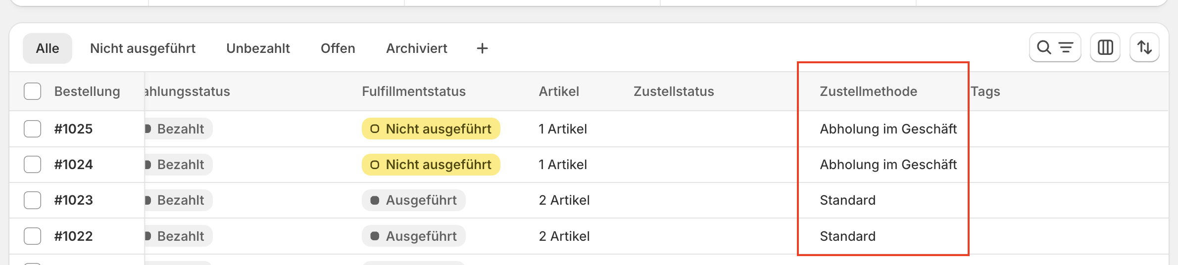 In Shopify erkennst du Bestellungen zur Abholung an der Zustellmethode Abholung im Geschäft.