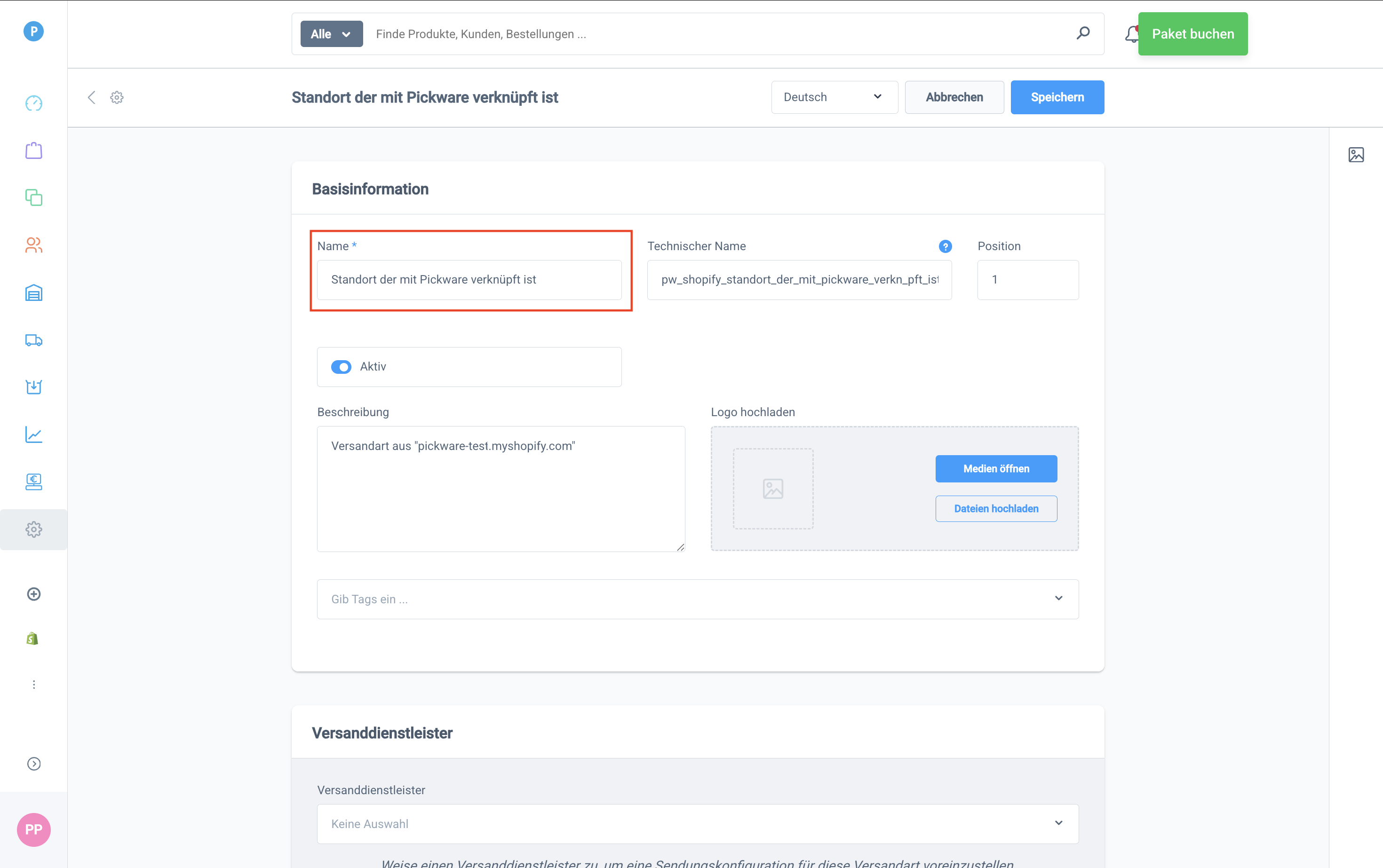 In Pickware wird mit dem ersten Import einer Click & Collect Bestellung automatisch eine entsprechende Versandart unter Einstellungen → Shop → Versand angelegt, wobei als Name der Versandart der Name des jeweiligen Shopify Standorts verwendet. Du musst diese Versandart nicht weiter konfigurieren. Wichtig ist, dass du in Pickware keinen Versanddienstleister hinterlegst, damit auch kein Versandetikett erzeugt wird.