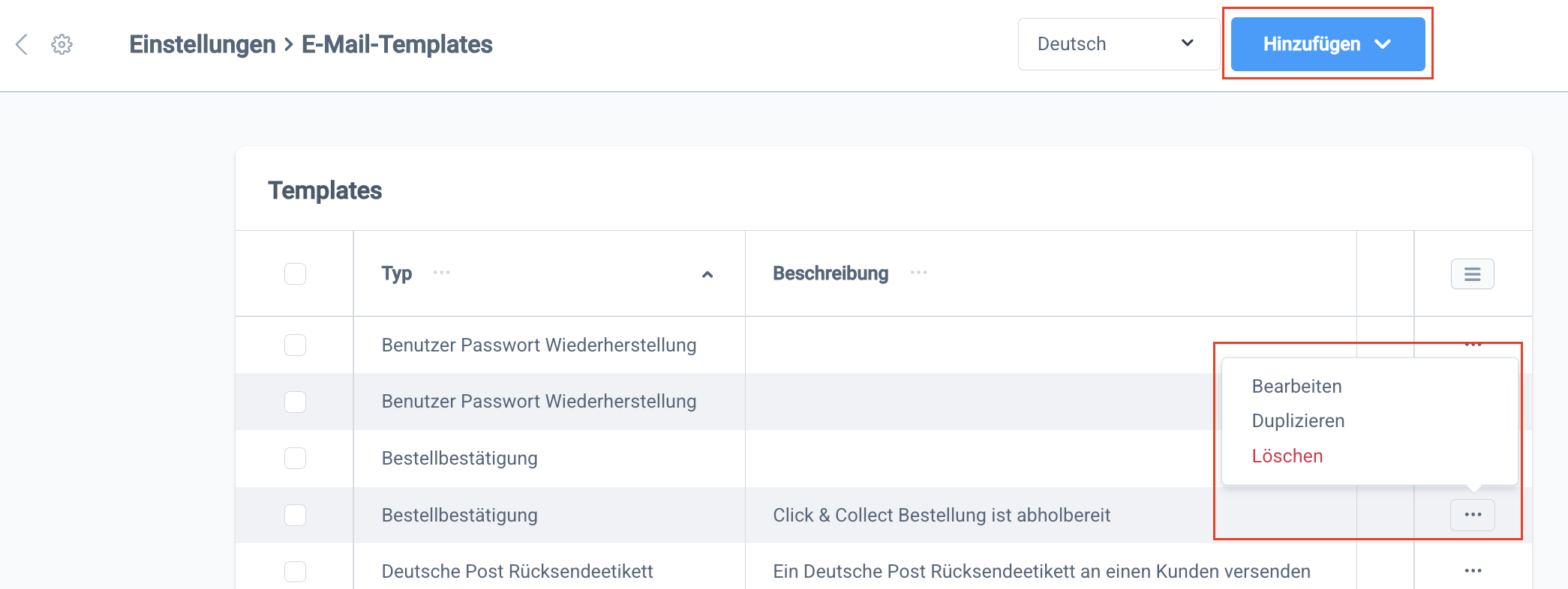 Zuerst erstellen wir das E-Mail Template. Klicke dazu unter Einstellungen → Shop → E-Mail-Templates auf Hinzufügen → E-Mail-Template hinzufügen. Alternativ kannst du auch ein bestehendes E-Mail-Template über das Kontextmenü duplizieren und dort den Text anpassen.