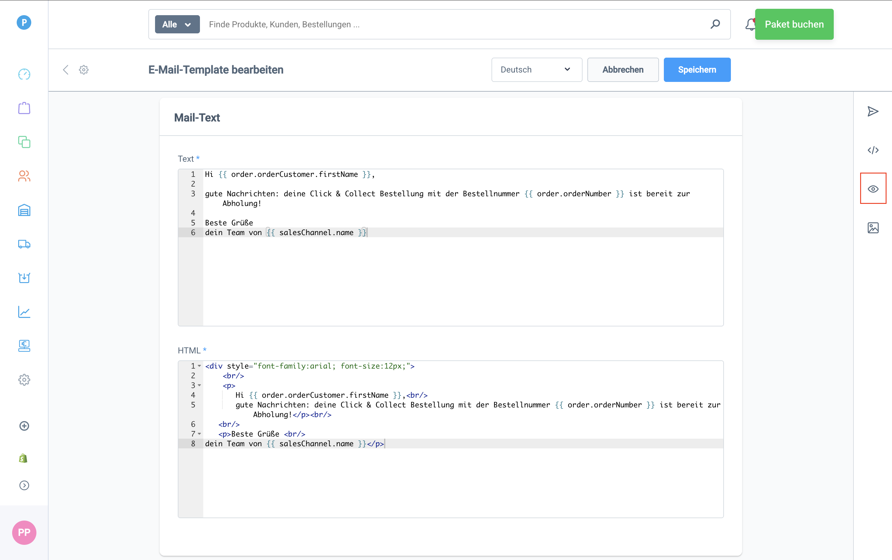 Den Text deiner E-Mail hinterlegst du im Bereich Mail-Text. Im Feld Text gibst du den reinen Text inklusive Variablen ein, im Feld HTML nimmst du die optische Gestaltung vor. Über das Augen-Symbol rechts an der Seite kannst du eine Vorschau deiner E-Mail sehen.
