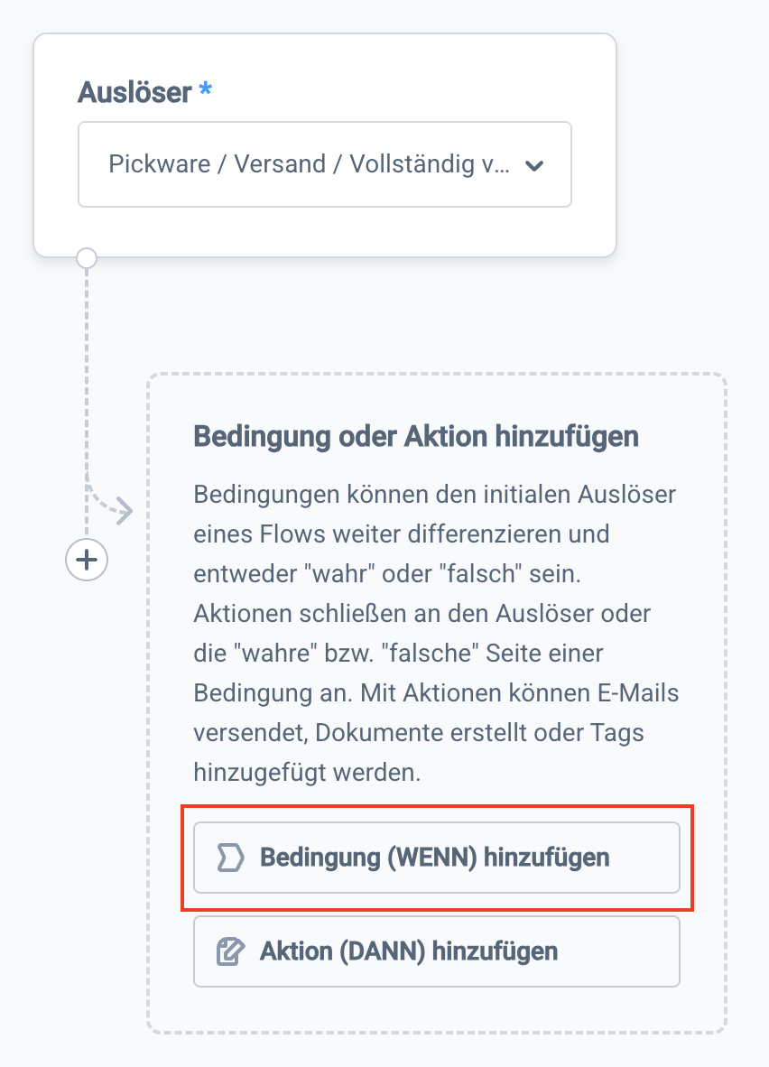 Wähle nun einen Auslöser, der am besten zu deinen Prozessen passt. Unter der Annahme, dass du deine Click & Collect Bestellungen nach der Kommissionierung direkt als versendet markierst, bieten sich beispielsweise Pickware → Versand → Vollständig versendet oder Status erreicht → Bestellung Lieferung → Status → Versendet an.