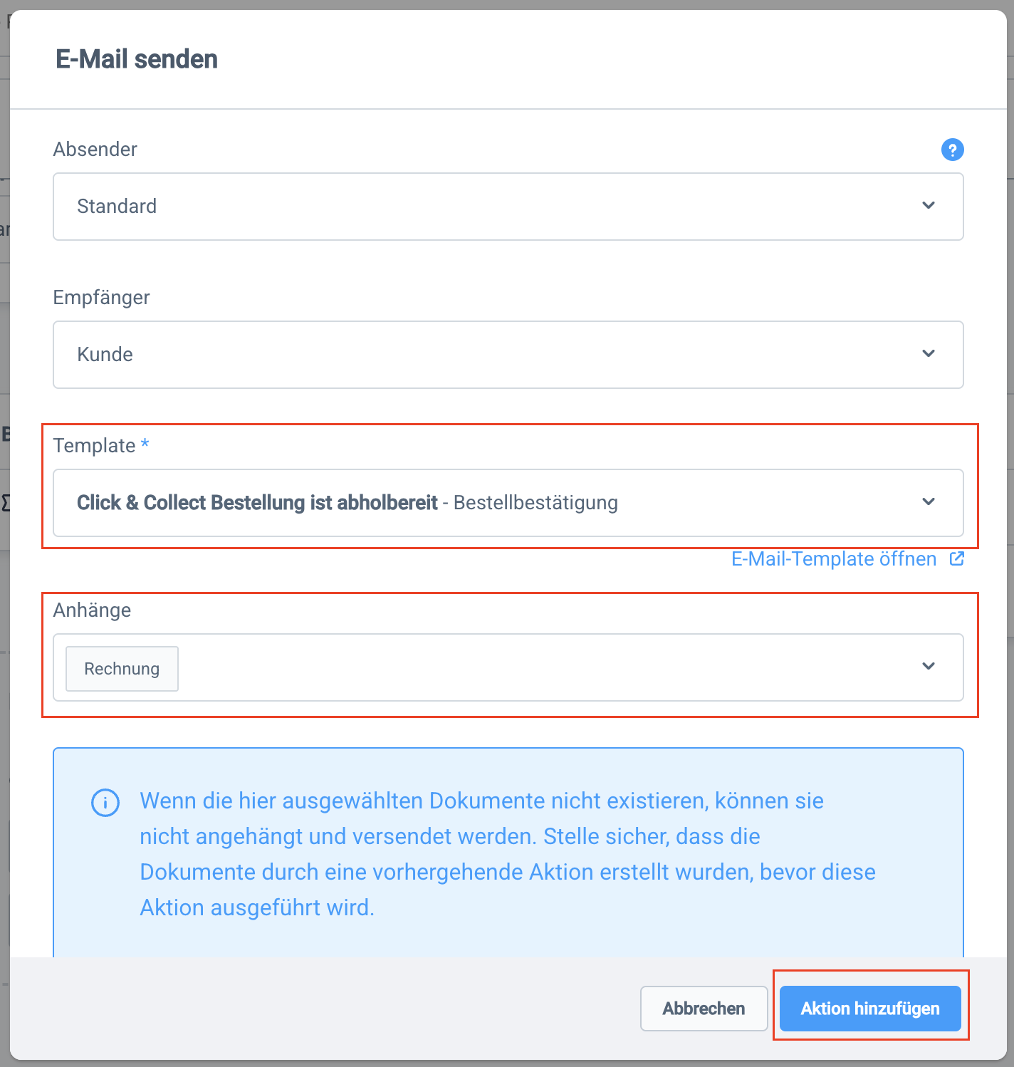 | Wenn die Bedingung erfüllt ist, soll eine E-Mail basierend auf der zuvor erstellten E-Mail-Vorlage versendet werden. Klicke daher hier Allgemein → E-Mail verschicken. Wähle im Template die entsprechende Vorlage aus. Wenn du möchtest, kannst du unter Anhänge noch festlegen, dass beispielsweise die Rechnung mitgesendet werden soll. Klicke dann auf Aktion hinzufügen. |