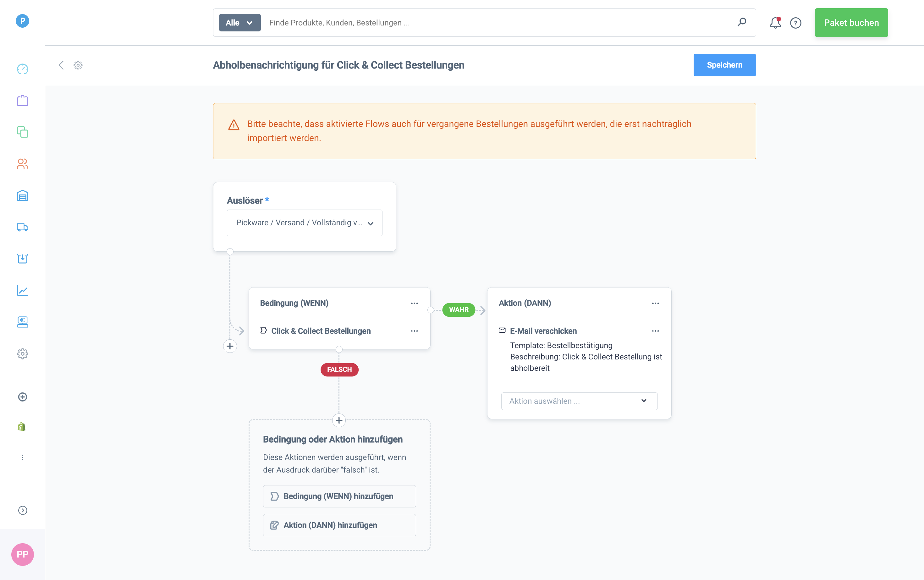 Speichere anschließend deinen Flow. Sobald du eine Click & Collect Bestellung nun als versendet markiert hast, sollte der betreffende Kunde bzw. die betreffende Kundin nun eine Abholbenachrichtigung per E-Mail erhalten.