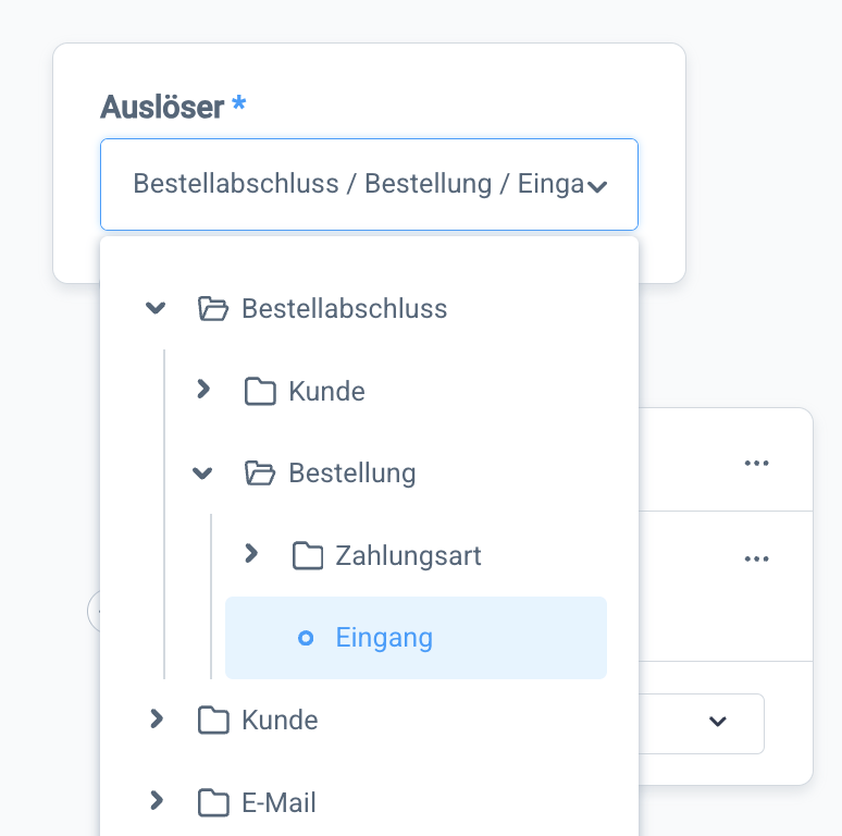 | Für unseren Fall verwenden wir folgenden Auslöser: Bestellabschluss → Bestellung → Eingang. | |