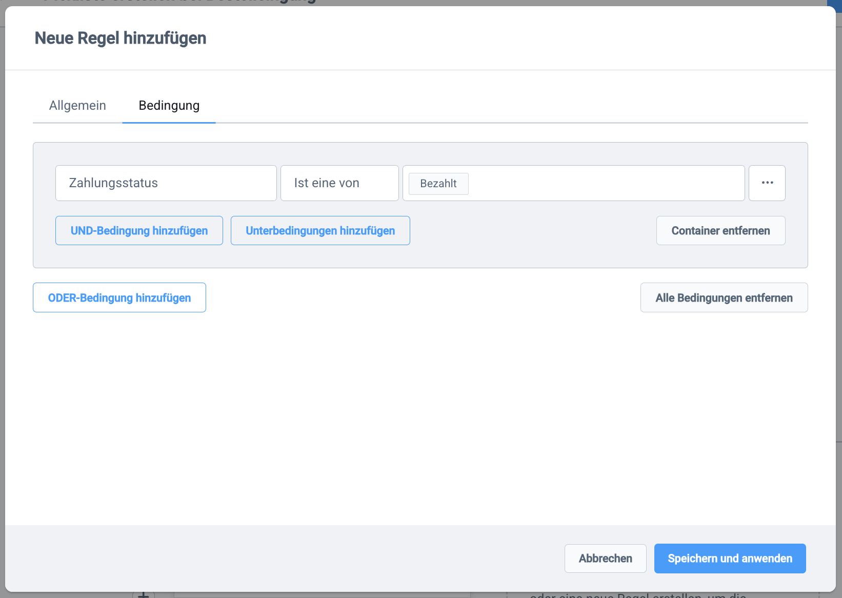 | Optional könntest du hier noch eine Bedingung einfügen, beispielsweise eine, die besagt, dass die betreffenden Bestellungen bezahlt sein sollen, bevor du eine Pickliste erstellst. Klicke dazu auf Bedingung (WENN) hinzufügen und wähle dann die entsprechende Regel aus. Wenn du noch keine passende Regel hast, kannst du hier direkt eine anlegen. Klicke dazu auf Neue Regel erstellen. Die Regel könnte beispielsweise wie folgt aussehen: | |